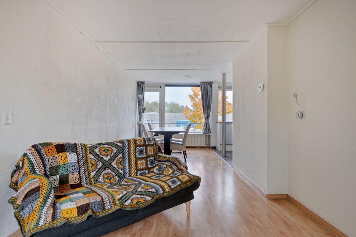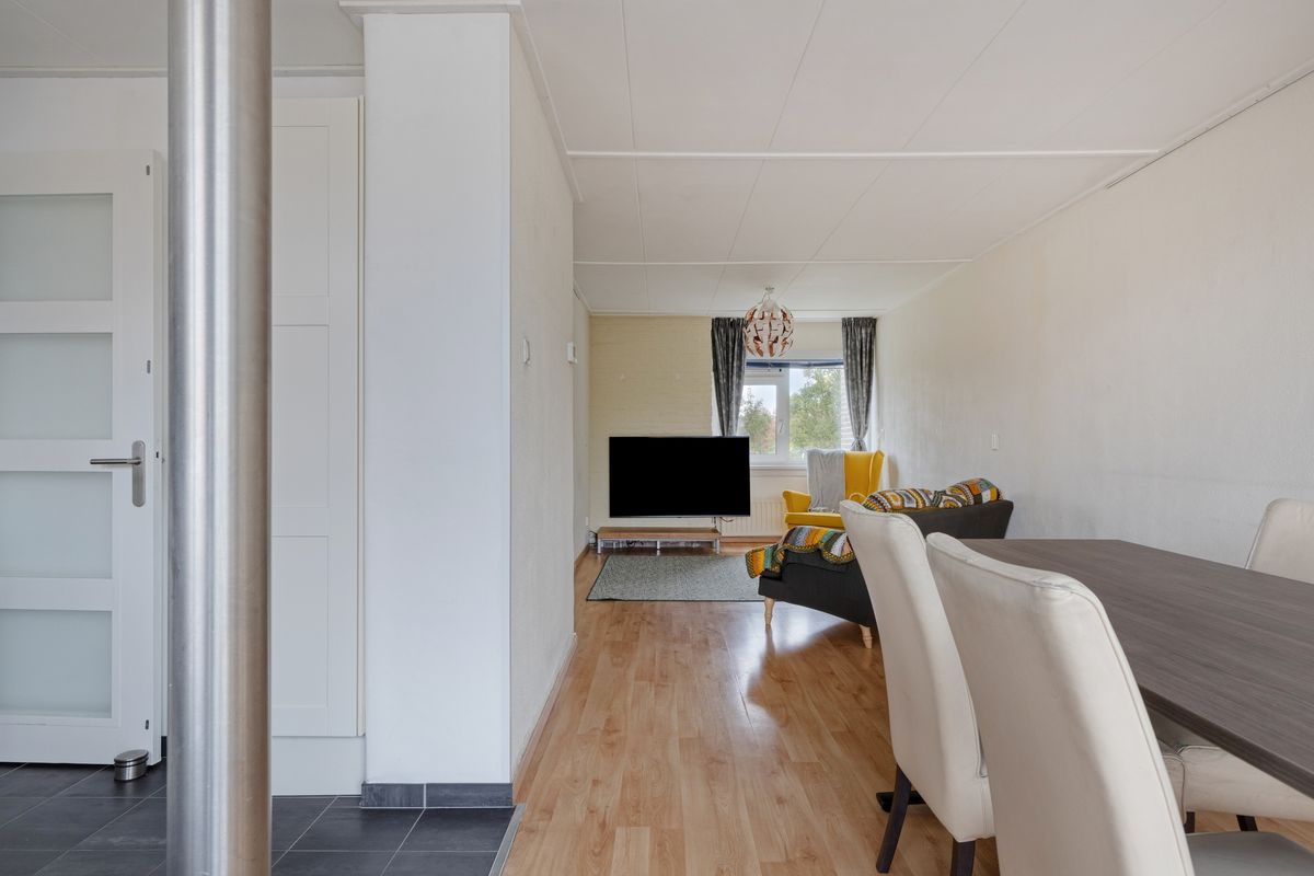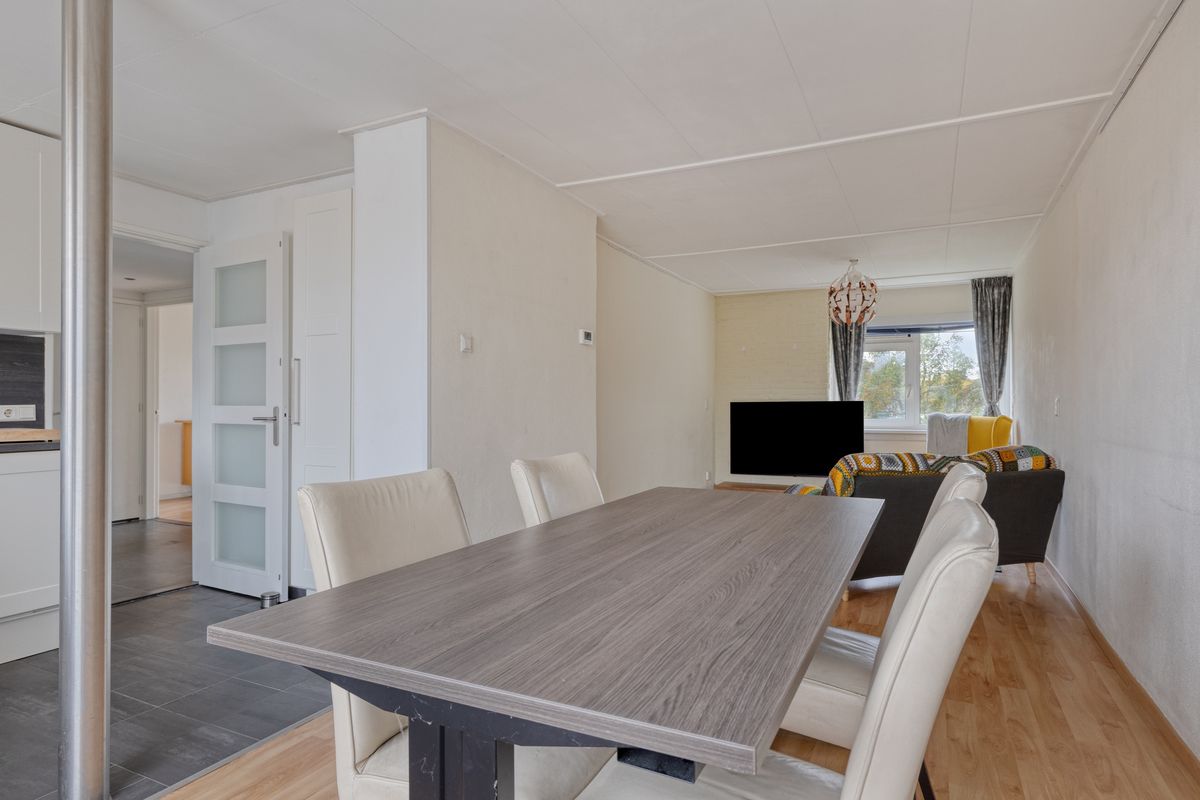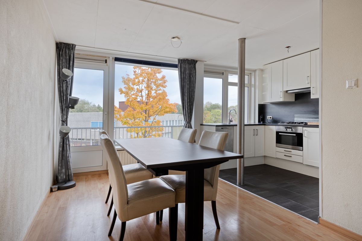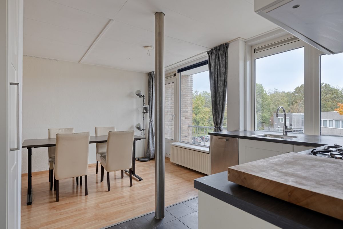 De woonkamer is over de volle diepte van het appartement, met eetgedeelte aan de voor-/straatzijde en zitgedeelte aan de achterzijde. De open keuken is netjes uitgevoerd in hoekopstelling en uitgerust met diverse apparatuur.