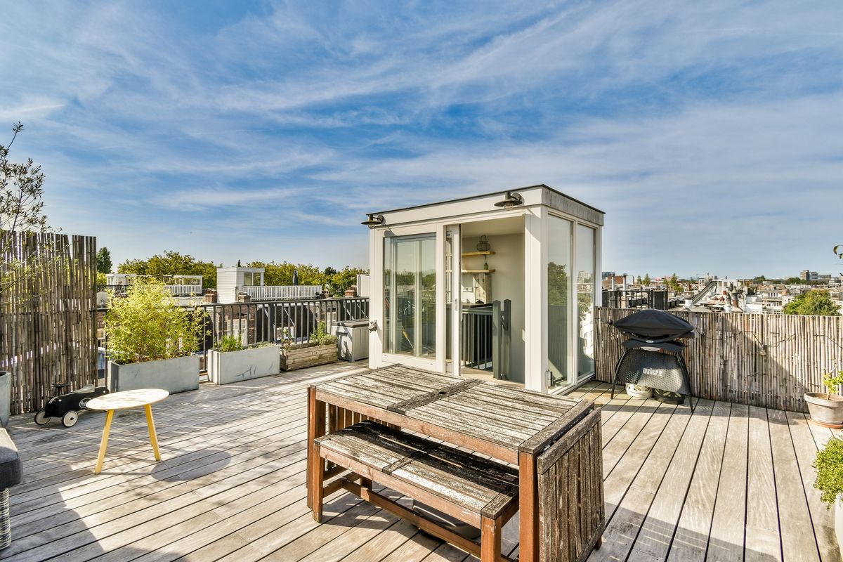 De vijfde etage geeft toegang tot het dakterras, te bereiken via de overloop. Deze overloop heeft een wastafel en een koelkast, ideaal voor zomerse avonden op het terras.