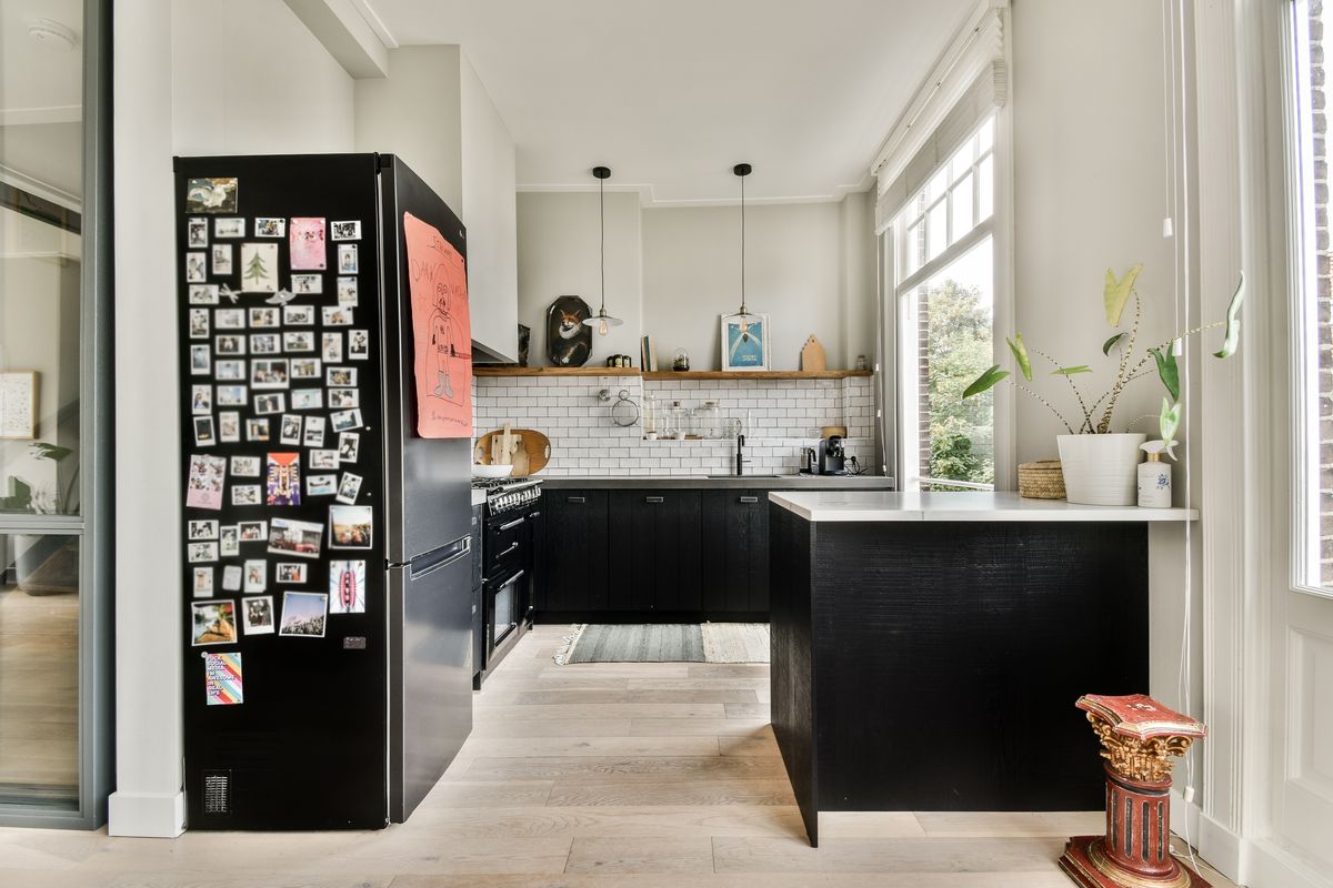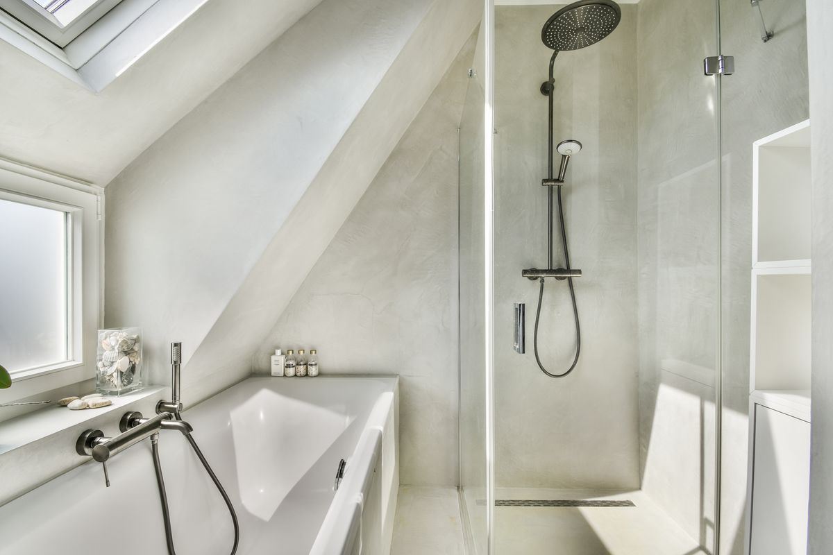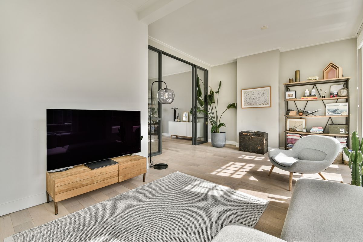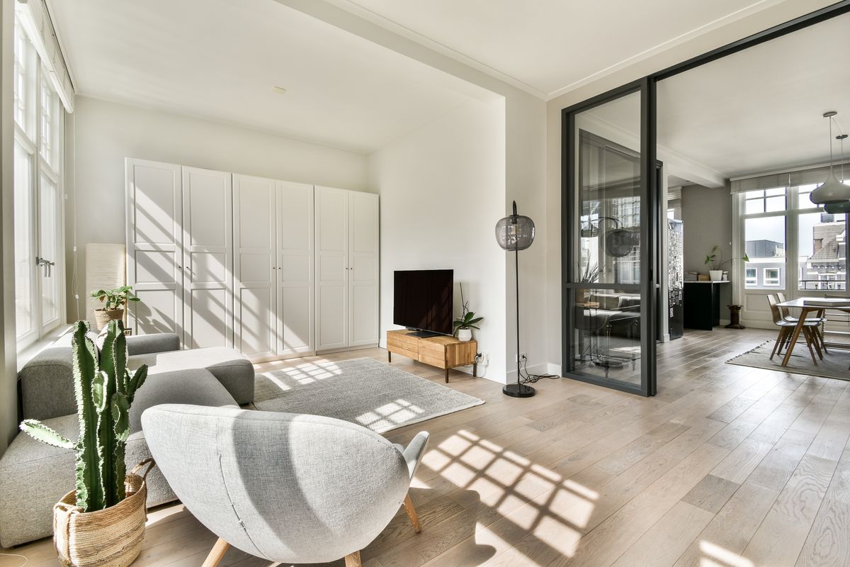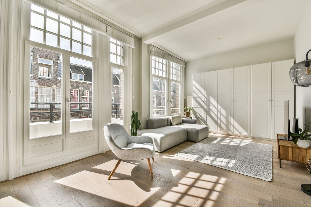 Through the shared entrance, there is access to the apartment on the second floor. From the internal staircase, you arrive in a hallway that gives direct access to both the living room and the open kitchen. The living room is located en suite at the front, making it easy to divide the space into a sitting and dining area. From the living room, double doors open onto a French balcony, overlooking Valeriusstraat. At the rear are the kitchen and dining area. The kitchen is equipped with built-in appliances including a Smeg gas stove, dishwasher, fridge-freezer, and a Quooker boiling-water tap.