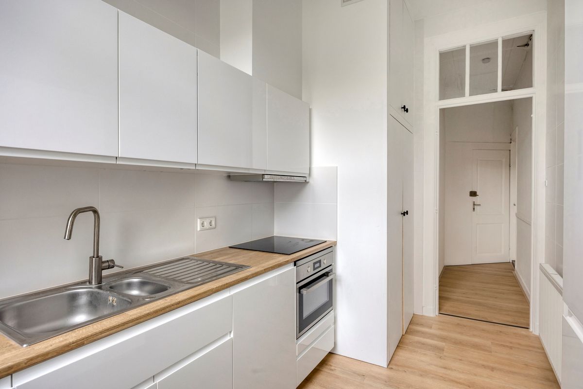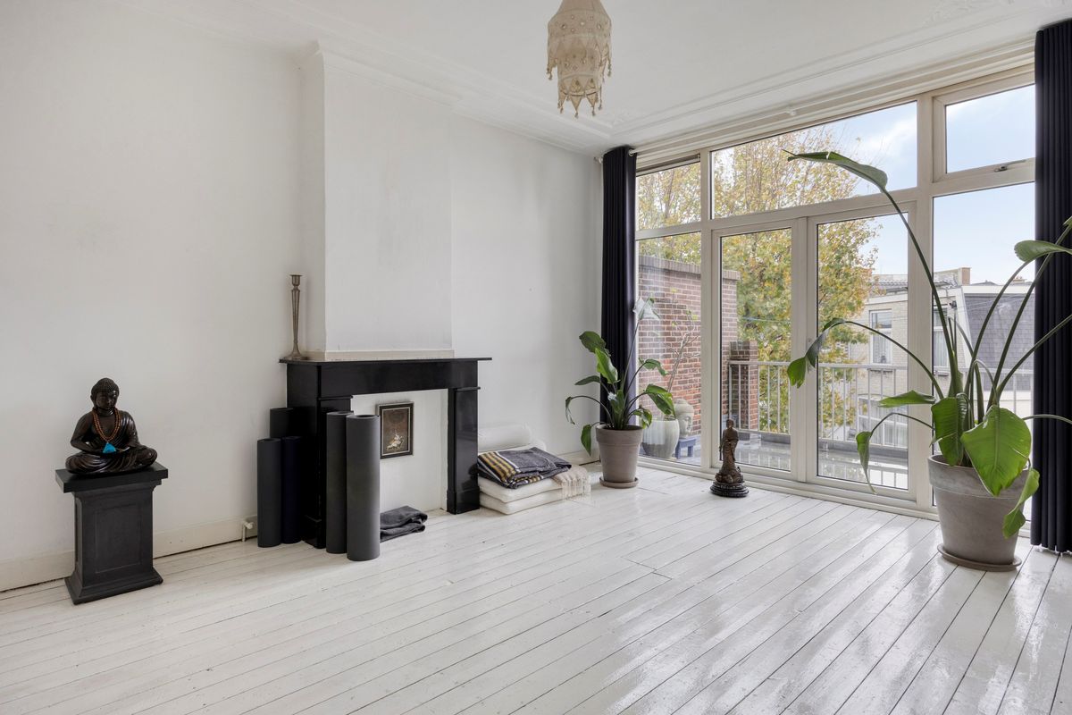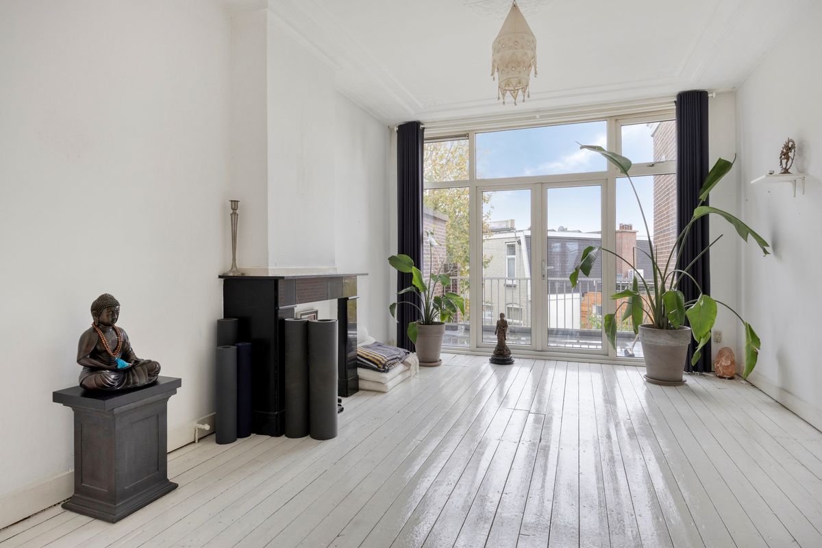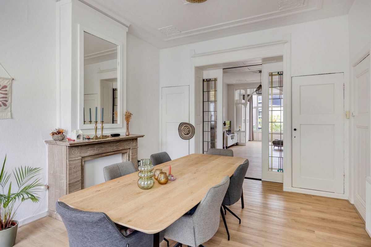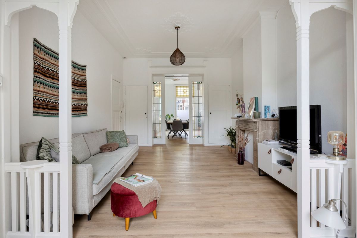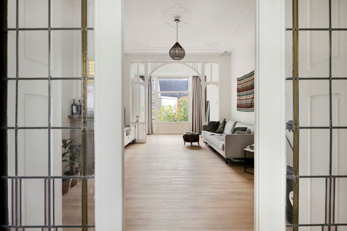 De aanwezigheid van authentieke details zoals paneeldeuren, hoge plafonds en sierlijsten geeft het appartement een karakteristieke uitstraling.