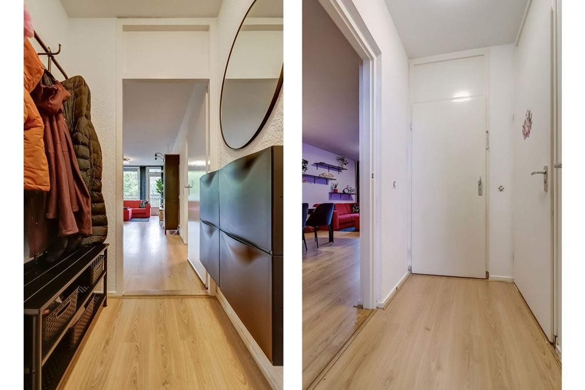 Bij binnenkomst stap je in de hal met meterkast. Vanuit hier loop je direct de lichte woonkamer in (ca. 24 m²), voorzien van een laminaatvloer, vaste kast en toegang tot de keuken, het balkon en de tussenhal.