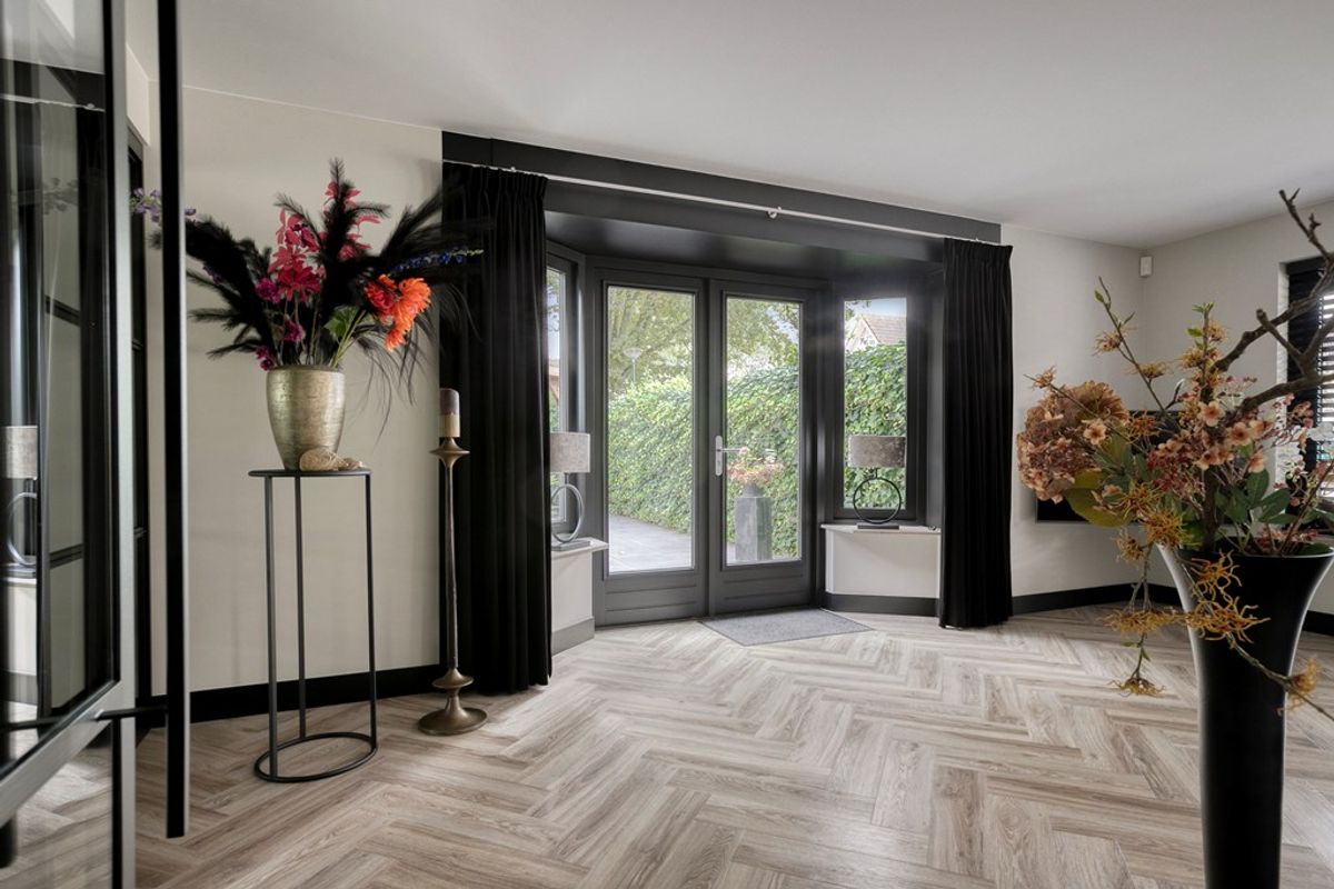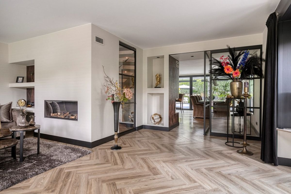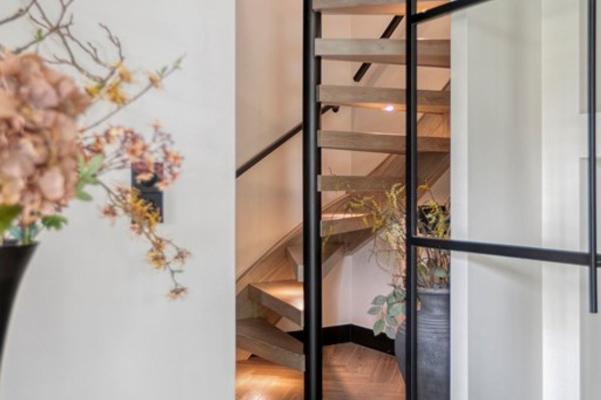 De entree zet meteen de toon: strak, modern en uitnodigend. Via de hal met toilet en trapopgang komt u middels een fraaie taatsdeur in de woonkamer, waar de grote ramen en openslaande deuren zorgen voor een overvloed aan licht. De visgraatvloer loopt drempelloos door en geeft de ruimte een chique uitstraling. De gashaard zorgt voor warmte en sfeer, terwijl de indeling uitnodigt om een gezellige zithoek te creëren. Aangrenzend vindt u de leefkeuken, gescheiden middels een stijlvolle wand. Een keuken die werkelijk alles heeft wat u van een moderne keuken mag verwachten: een riant kookeiland met barfunctie, sfeervolle verlichting en hoogwaardige apparatuur, waaronder een combi-oven, koffiemachine, inductiekookplaat met geïntegreerde afzuiging, koel- en vrieskast, Quooker en zelfs een wijnklimaatkast. Ook de keuken is voorzien van een gezellige sfeerhaard en er is airconditioning aanwezig. Vanuit de eetkamer heeft u uitzicht op de tuin en directe toegang tot het overdekte terras middels een schuifpui. De inpandige garage is tevens bereikbaar vanuit de keuken, wat het geheel praktisch maakt.
