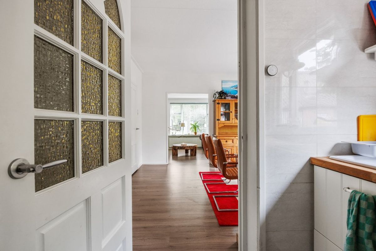 Bij binnenkomst via de zijkant van de woning, komt u direct in de ruime entree die toegang geeft tot de bijkeuken en de keuken. De keuken heeft een praktische indeling en vanuit hier is er toegang tot de badkamer op de begane grond en een apart toilet. De eetkamer bevindt zich in open verbinding met de woonkamer, waardoor een lichte ruimte ontstaat. Deze open verbinding kan eenvoudig worden afgesloten met schuifdeuren, waardoor er de mogelijkheid is voor een meer gescheiden indeling. Vanuit de eetkamer heeft u toegang tot de hal met trapopgang naar de eerste verdieping. Tevens is er toegang tot een inpandige berging met praktische voorzieningen zoals de witwasgoedaansluiting en de cv-ketel (uit 2016).
