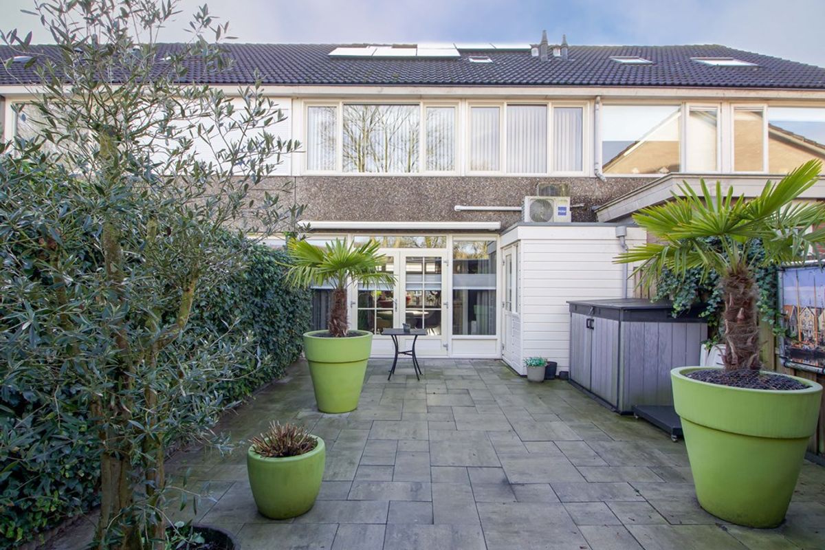 De achtertuin is diep, strak aangelegd en volledig betegeld, waardoor hij zeer onderhoudsvriendelijk is. Direct aan de woning bevindt zich een ruim terras met voldoende plek voor een zit- of eethoek. De tuin is aan beide zijden omsloten door schuttingen met groene begroeiing, wat zorgt voor privacy en een groene uitstraling.