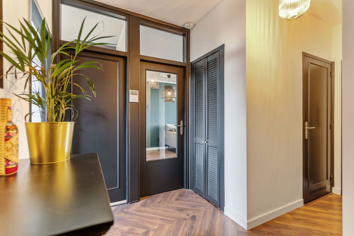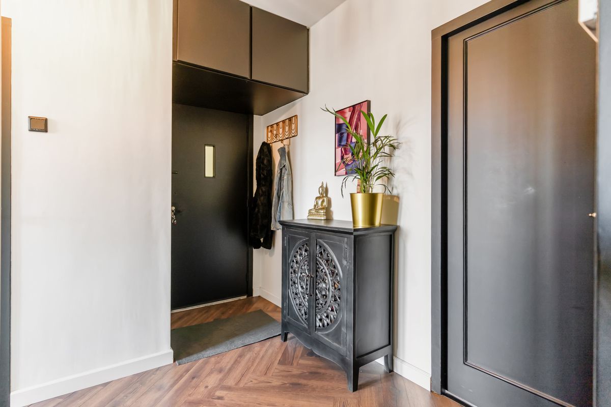Aan de andere zijde bevindt zich de aparte, moderne keuken. Deze is voorzien van strakke inbouwapparatuur, waaronder een oven, inductiekookplaat, afzuigkap, koelkast en vaatwasser. Via de woonkamer en keuken heb je toegang tot een fijn balkon.