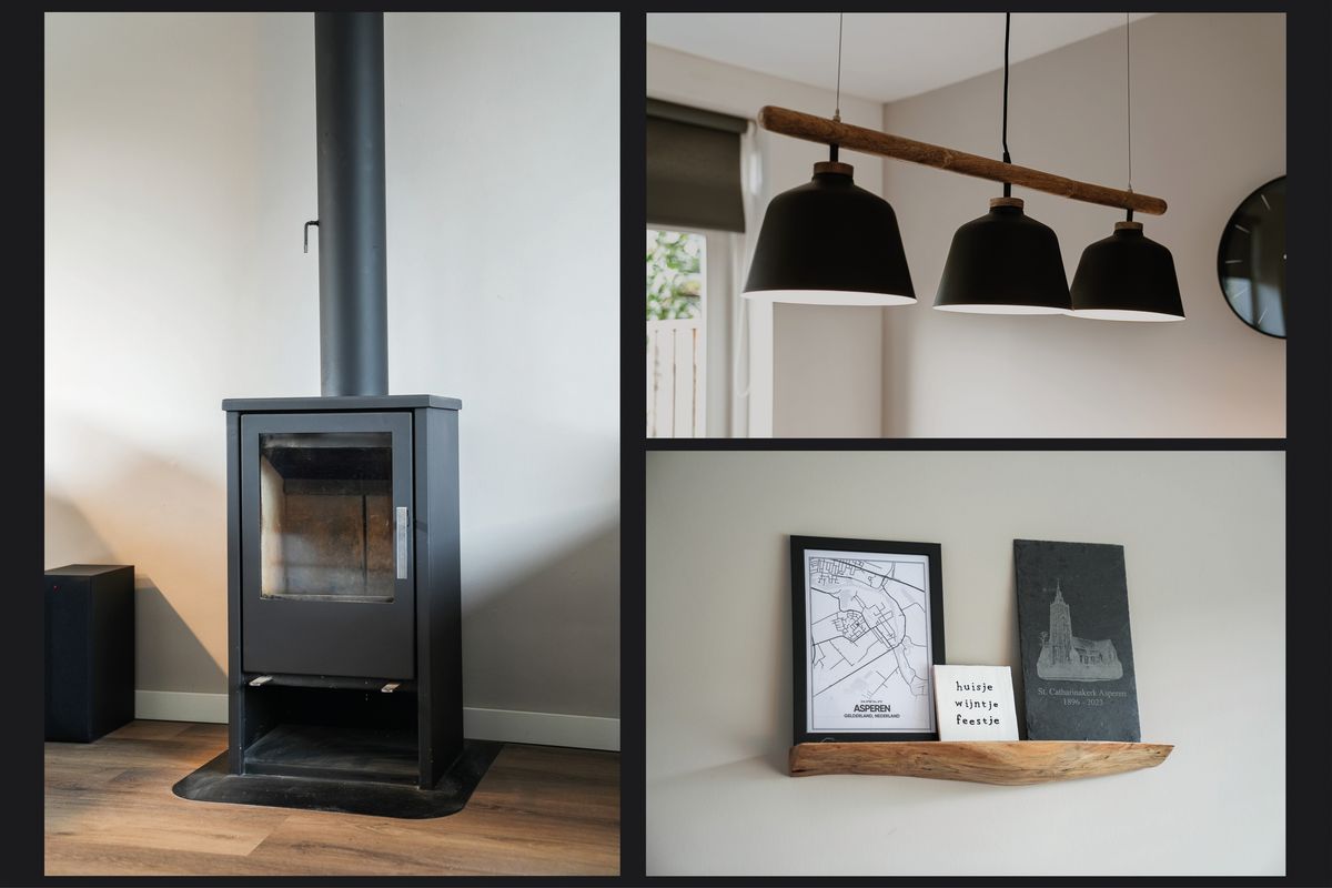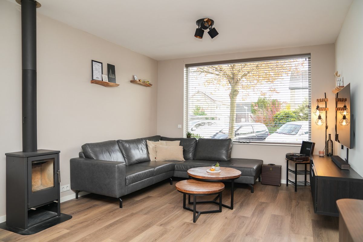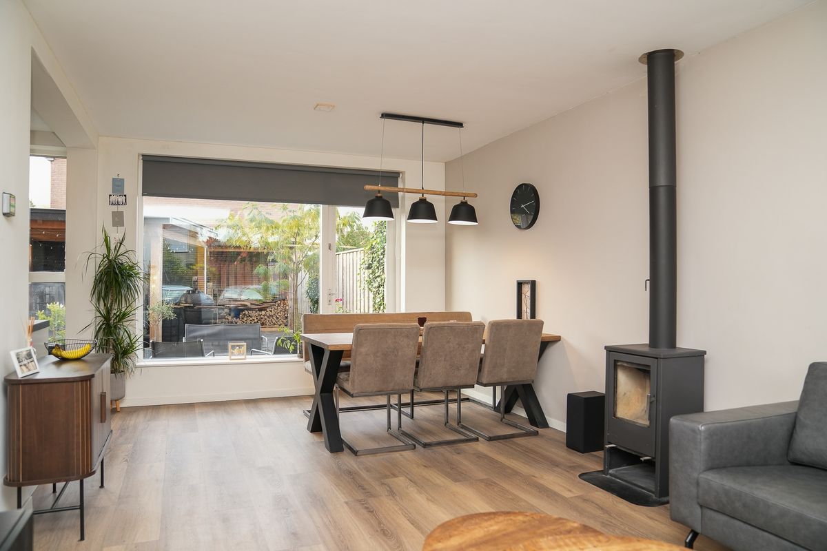 Je komt binnen in de hal met meterkast, trapopgang en het moderne toilet. Vanuit de hal stap je de woonkamer in. Deze ruimte voelt direct prettig aan: licht, open en met een warme uitstraling. De houtkachel vormt letterlijk en figuurlijk het middelpunt. Aan de achterzijde ligt de keuken, in een praktische L-opstelling. Je kijkt vanuit hier uit op de tuin en hebt via een loopdeur direct toegang naar buiten. De vloer is afgewerkt met pvc en voorzien van comfortabele vloerverwarming.