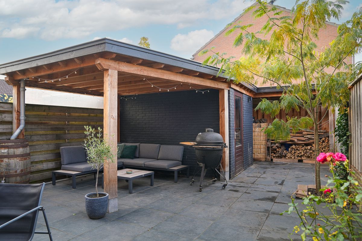 De achtertuin is verzorgd aangelegd en gericht op praktisch gebruik én comfort. Direct aan de woning ligt een terras, ideaal voor een eettafel of loungeset. Achterin de tuin staat een robuuste houten overkapping – een plek waar je het hele jaar door kunt zitten, koken of gasten ontvangen. Er is ruimte genoeg voor een buitenkeuken of barbecueplek. De tuin is bereikbaar via een achterom en heeft daarnaast een ruime berging voor fietsen en opslag.