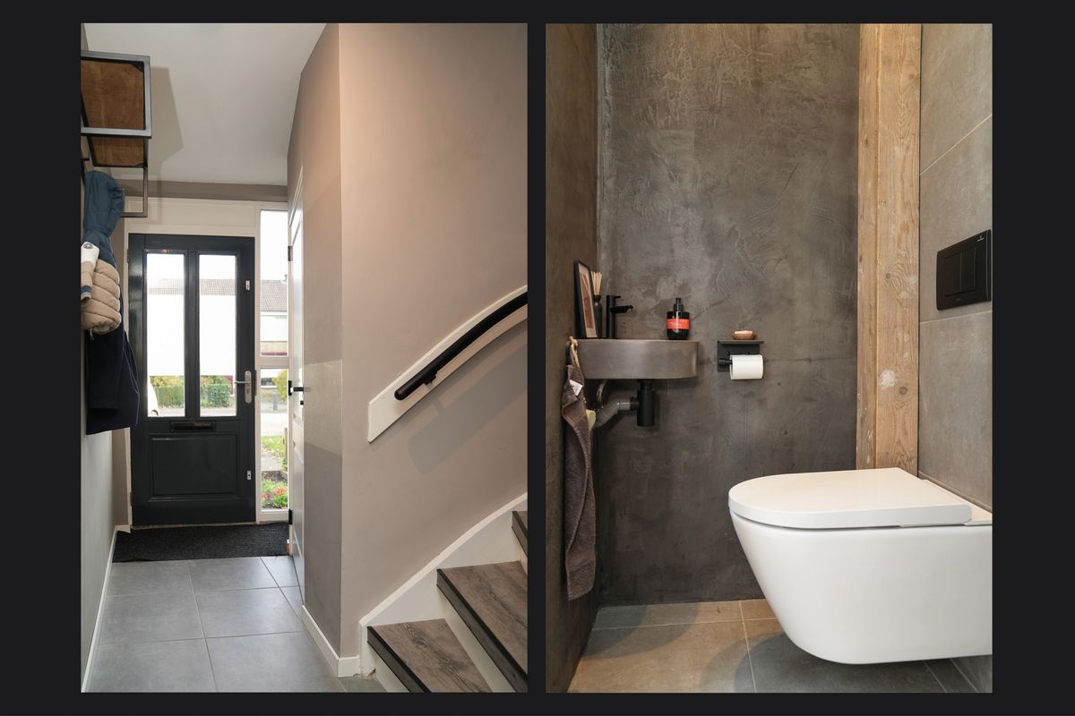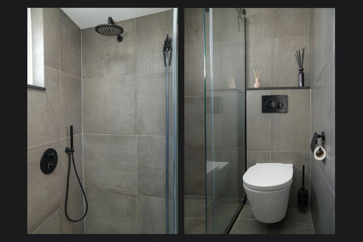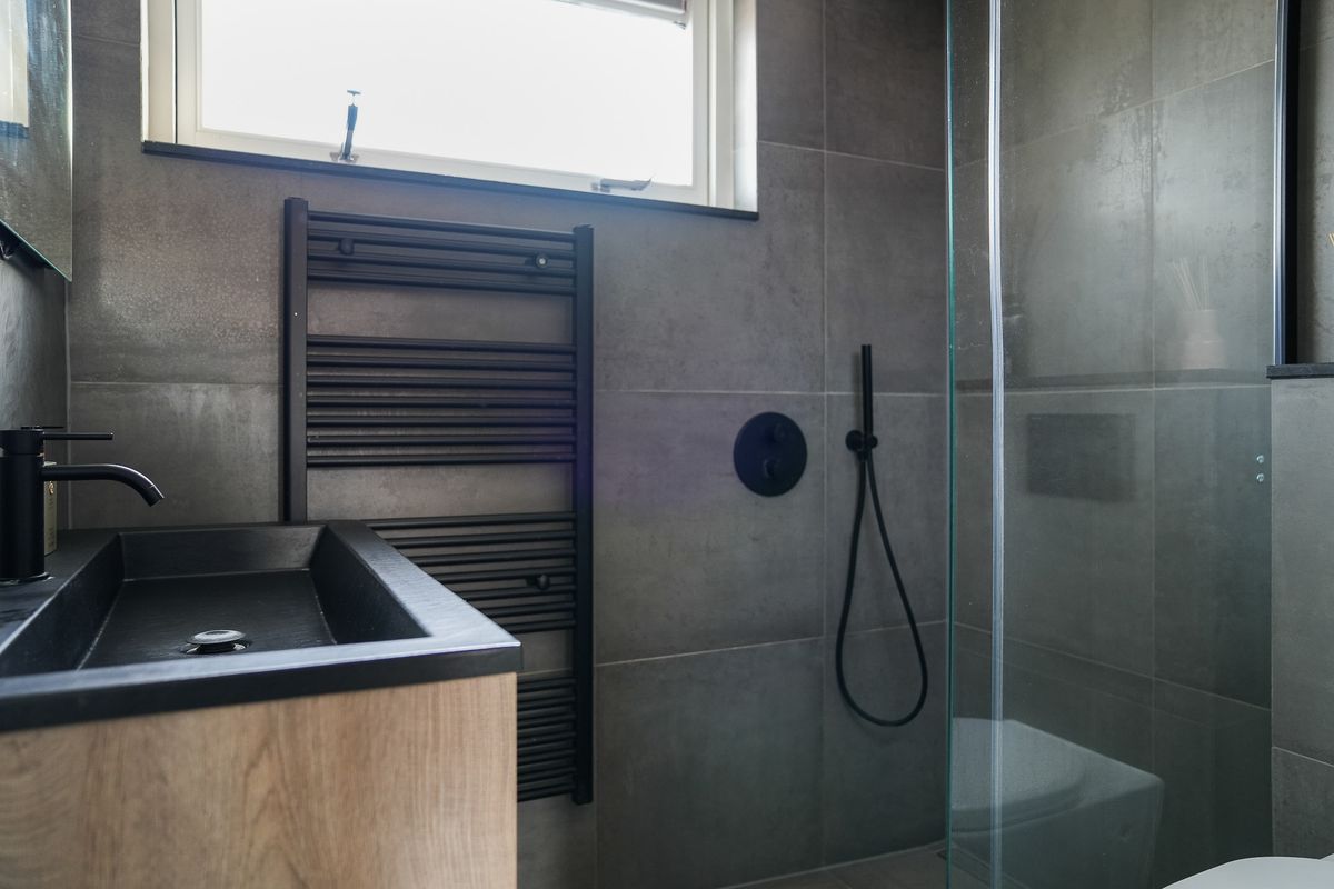 De badkamer is strak en stijlvol uitgevoerd in betonlook. De inloopdouche met glazen wand en zwarte accenten geeft het geheel een moderne uitstraling. Het wastafelmeubel biedt voldoende opbergruimte en het tweede toilet is hier mooi weggewerkt. Alles is netjes afgewerkt, waardoor de badkamer rust en comfort uitstraalt.