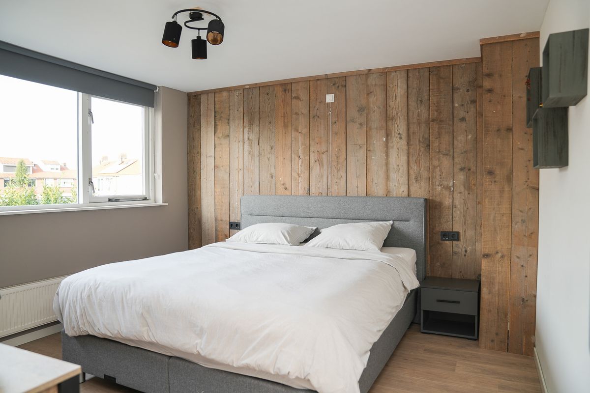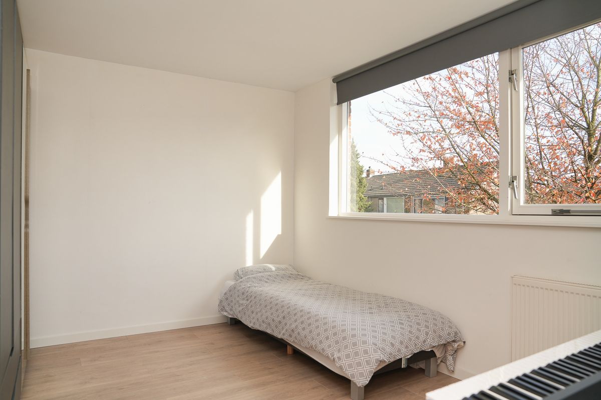 Op de eerste verdieping zijn drie slaapkamers. De grootste ligt aan de achterzijde en voelt als een rustige, beschutte plek. Er is voldoende ruimte voor een tweepersoonsbed, kledingkast en eventueel een werkhoek. De andere kamers zijn goed in te delen als kinder-, werk- of logeerkamer.