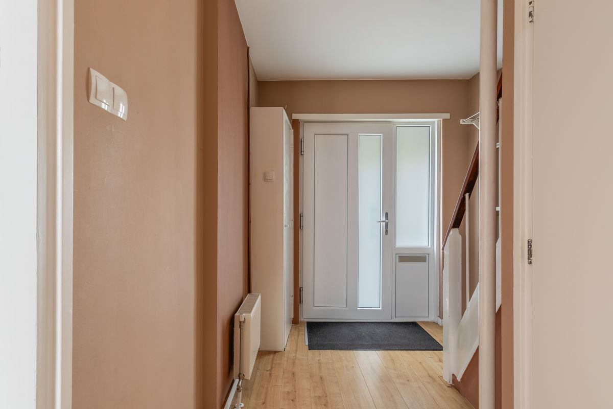 Via de entree met meterkast, toilet, trapkast en trapopgang kom je binnen in de lichte doorzonwoonkamer. Dankzij de grote raampartijen valt er volop daglicht binnen, wat zorgt voor een aangename sfeer. Aan de achterzijde bevindt zich de keuken, eenvoudig maar functioneel ingericht en voorzien van aansluitingen voor diverse apparatuur. Vanuit hier stap je direct de serre in (ca. 18 m²) — een heerlijke extra leefruimte met verwarming en horren, waar je het hele jaar door kunt genieten van het uitzicht op de tuin.