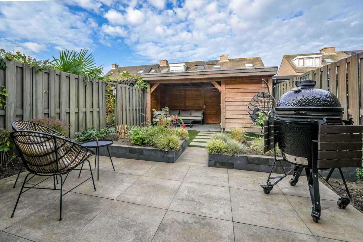 * De achtertuin (2023) is gelegen op het Westen voorzien van houten berging met veranda en een achterom.