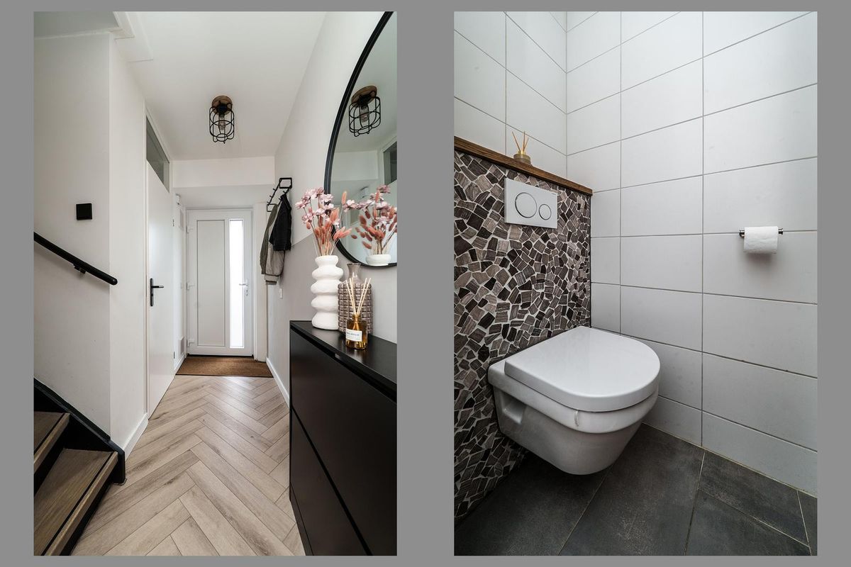 * Hal met het toilet, trapopgang naar de eerste verdieping en toegang tot de woonkamer;