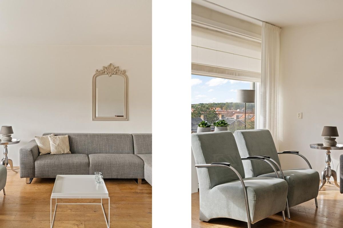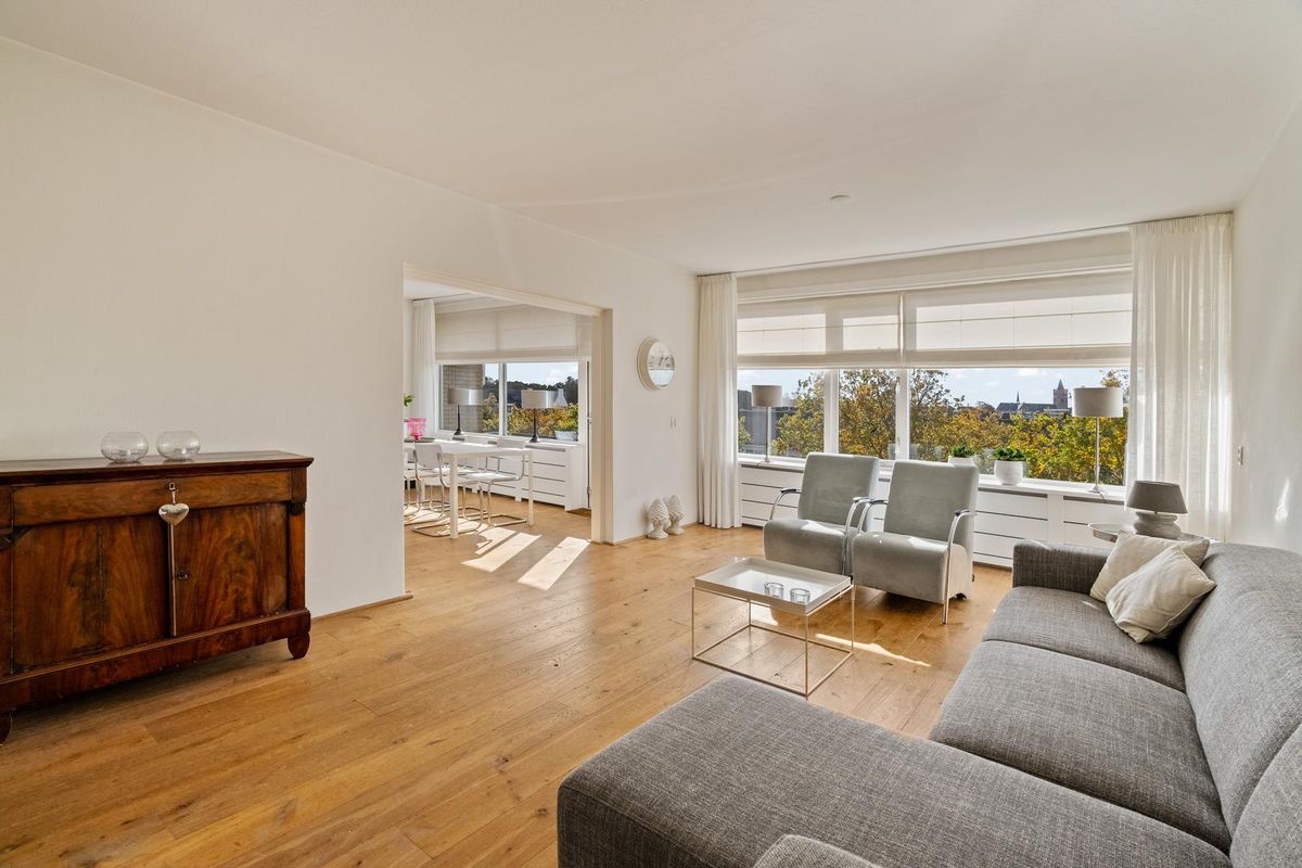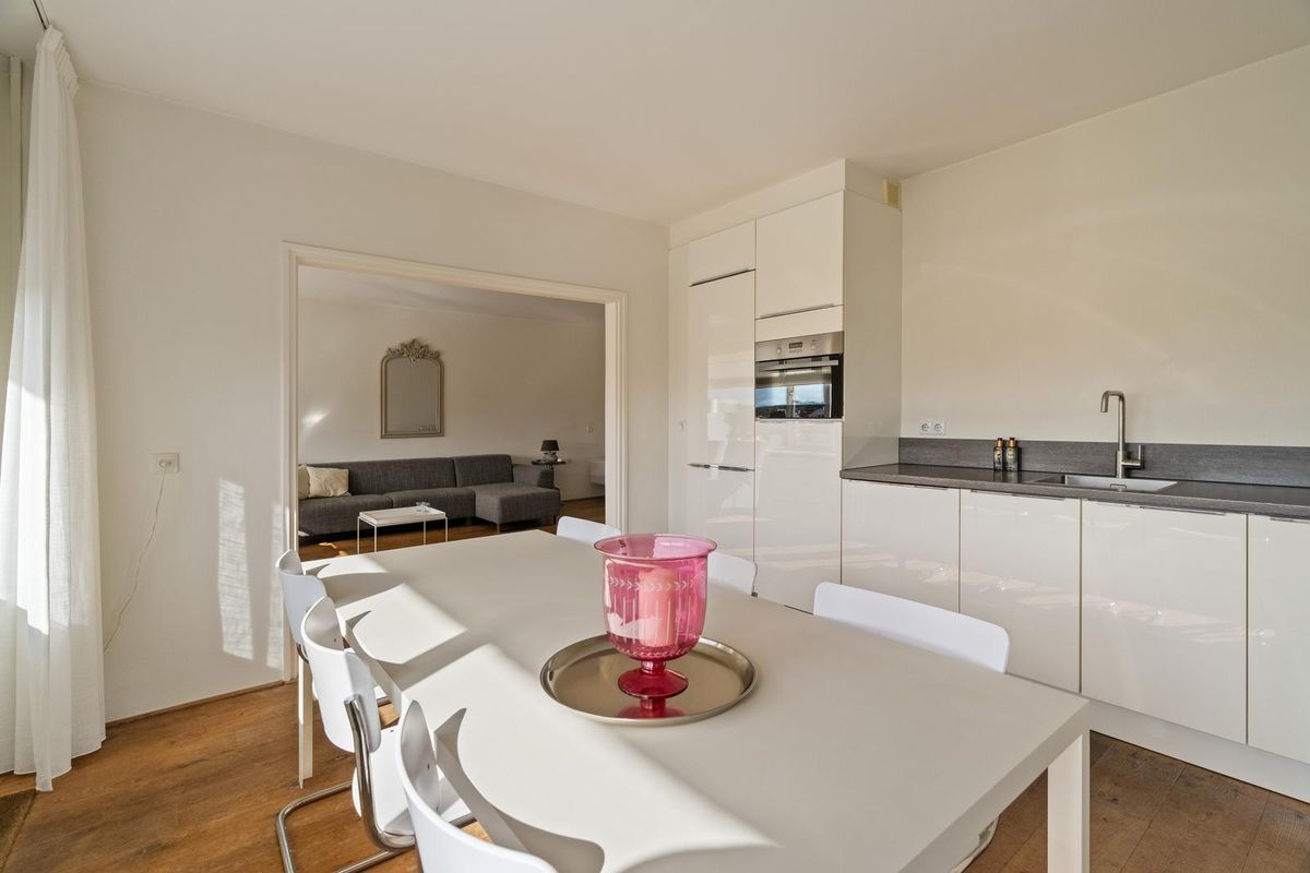 De woonkamer met aansluitend de open woonkeuken is ruim en licht dankzij de grote raampartijen en de verzorgde afwerking. De massief houten vloer, luxe binnendeuren, strak gestucte wanden en plafonds geven het appartement een aangename, stijlvolle sfeer.