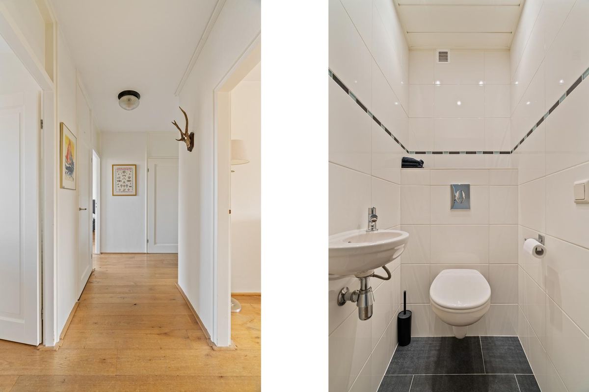 In de hal bevinden zich een garderobe, meterkast, vaste bergkast met een 80-liter warmwaterboiler én een praktische bijkeuken (voorheen keuken) met extra bergruimte en toegang tot het tweede balkon aan de achterzijde van het appartement. Hier is eventueel ook een slaapkamer te creëren.