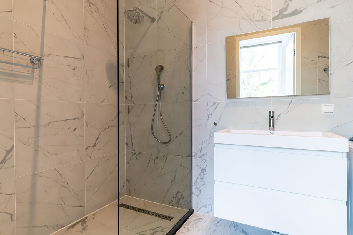 There is a separate bedroom present. The sleek bathroom is fully fitted with a walk-in shower, a vanity with wash basin and mirror, and a washer-dryer. A separate toilet is present.