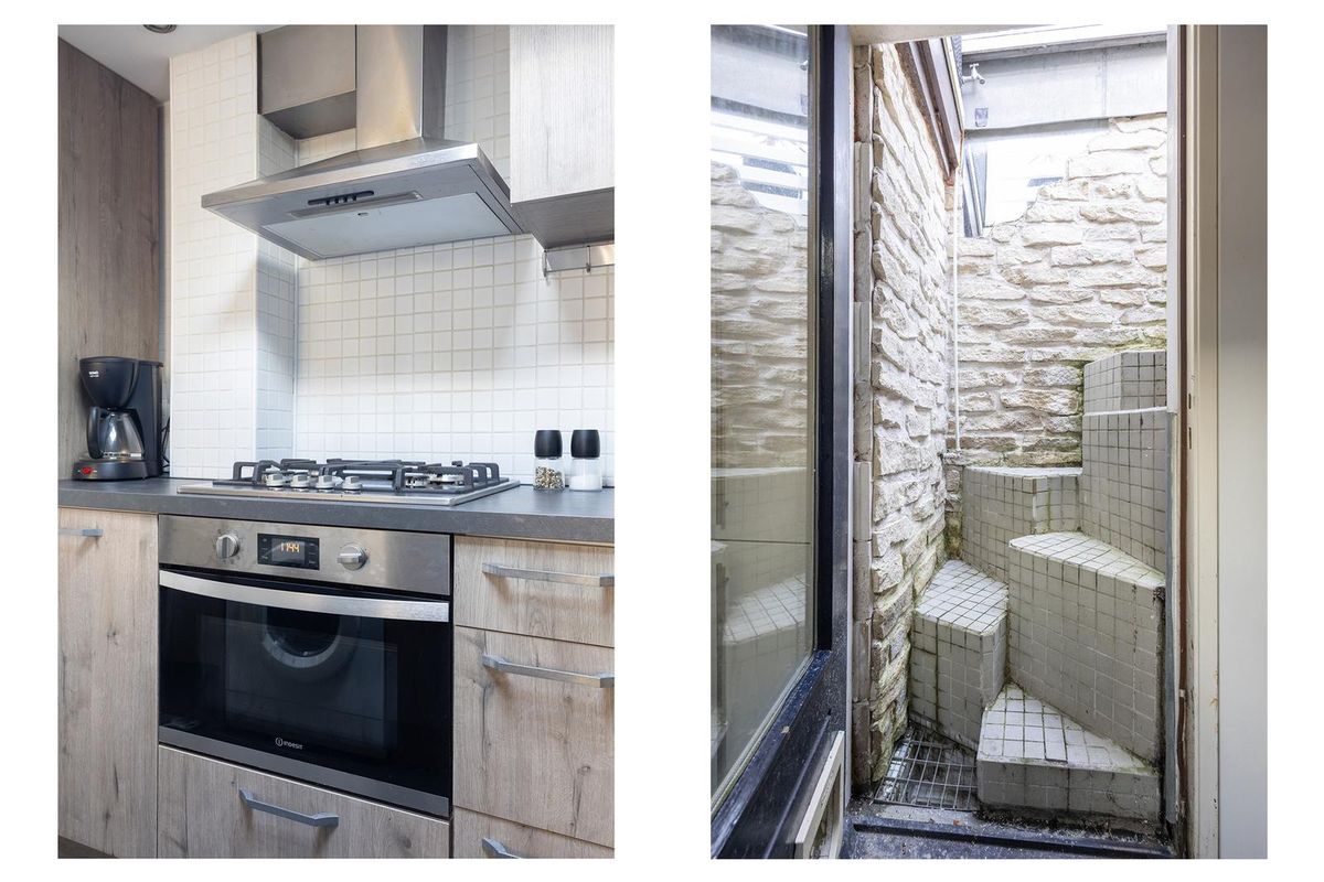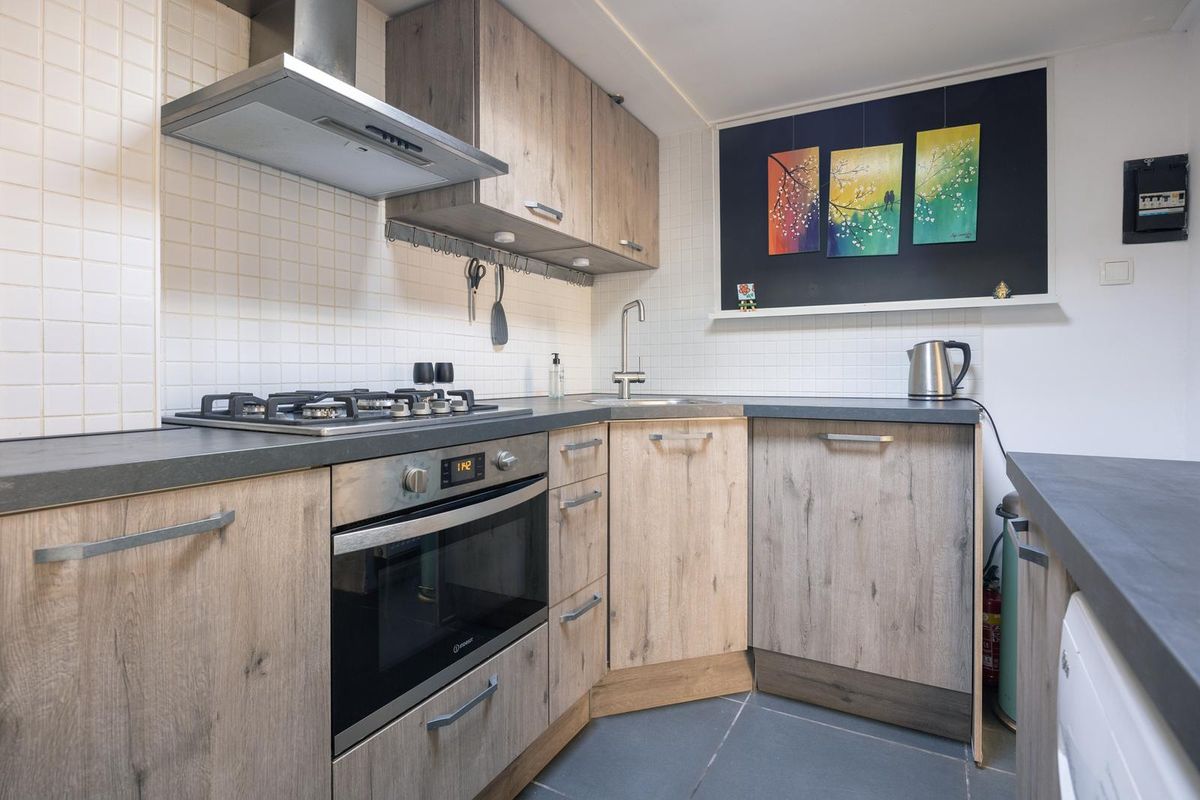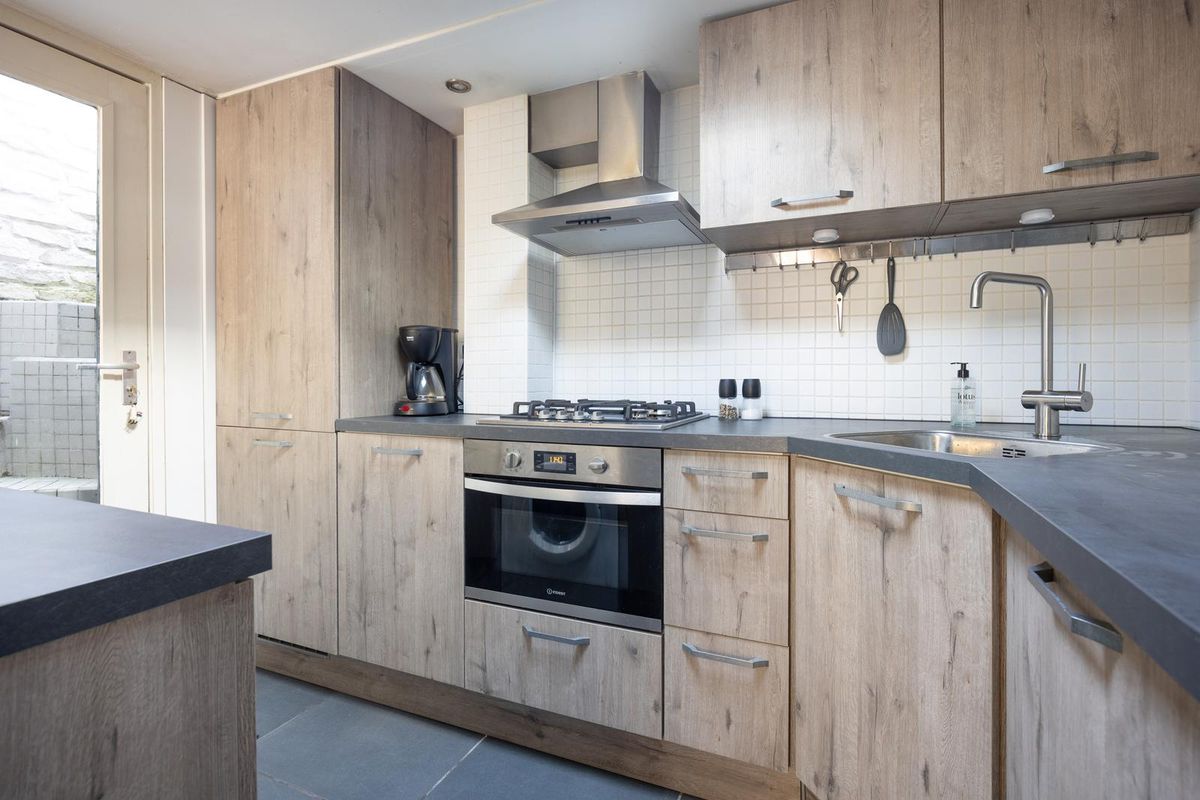 De keuken is uitgevoerd in een warme houtlook en voorzien van alle gemakken: een 4-pits gaskookplaat, oven, afzuigkap, vaatwasser, koelkast en vriezer. Ook de witgoedaansluiting is hier netjes weggewerkt. Via een deur in de keuken kom je bij een trap die je direct naar het dakterras brengt. Ideaal op zomerse dagen!