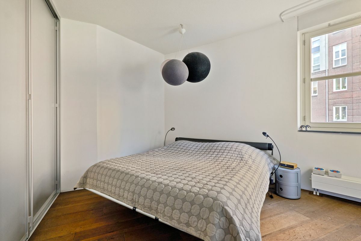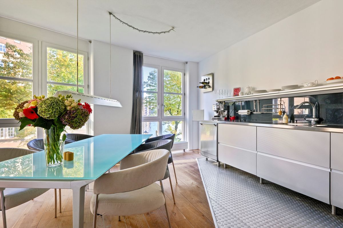 At the front, you’ll find the modern living room – the perfect place to relax and recharge after a busy day, with the added bonus of a wonderful view over the canal. From here, you can step directly onto the balcony, where you can enjoy the same beautiful scenery.