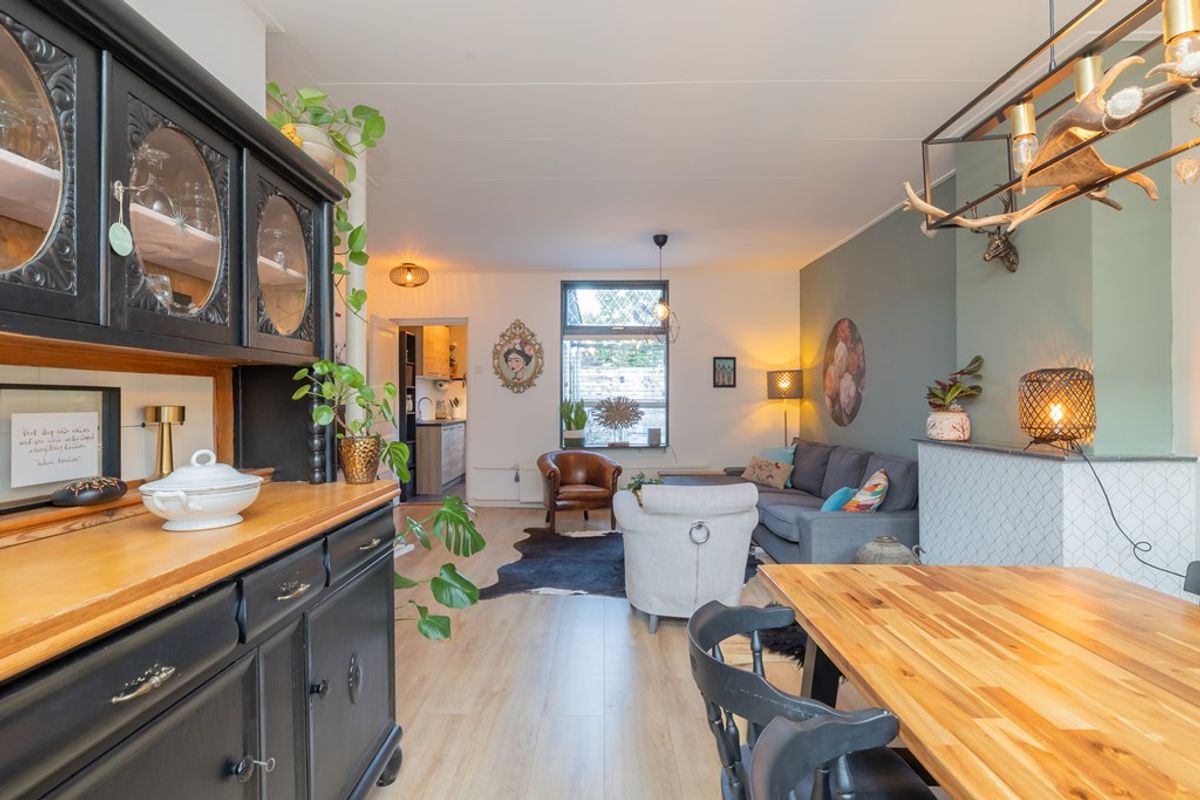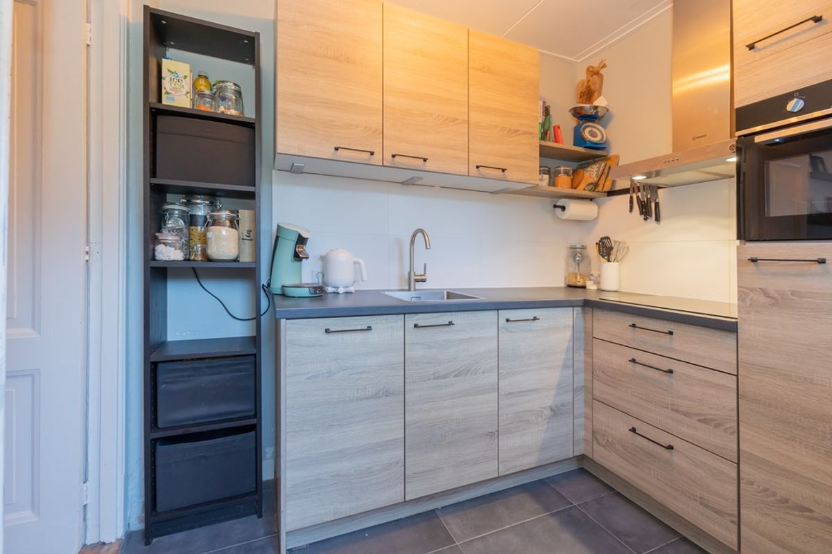 U komt binnen in een kleine hal met de meterkast en de keurig en volledig betegelde toiletruimte. De ruime woonkamer is echt een heerlijke plek om vertoeven met aan de voorkant de gezelligheid van de straat en aan de achterzijde de rust in de achtertuin. De keuken is gelegen aan de achterzijde en is voorzien van diverse inbouwapparatuur zoals kleine vaatwasser, een spoelbak, een magnetron en een inductie kookplaat met afzuigkap. Via de keuken is de achtertuin te bereiken met een stenen berging, hier bevindt zich de CV-ketel (Remeha).
