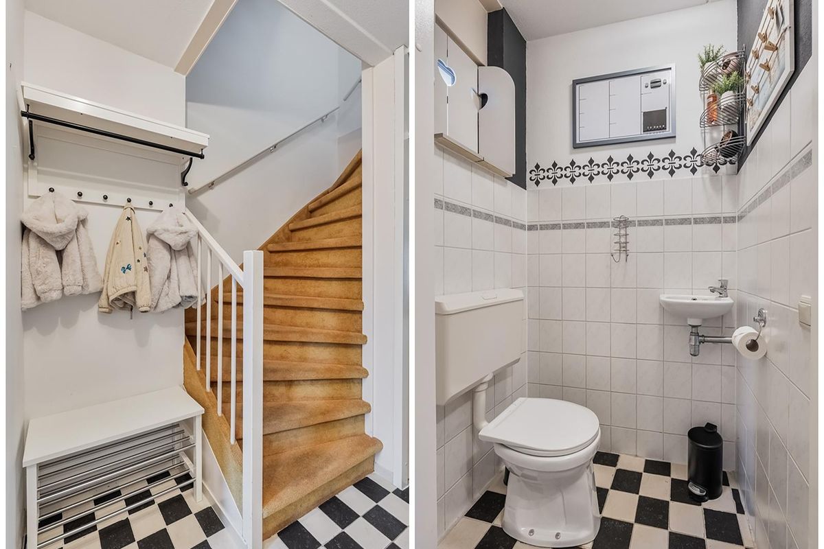Entree, ruime hal met meterkast en trap naar de 1e verdieping, toiletruimte voorzien van een duoblok toilet en fonteintje. De toiletruimte is gedeeltelijk betegeld.