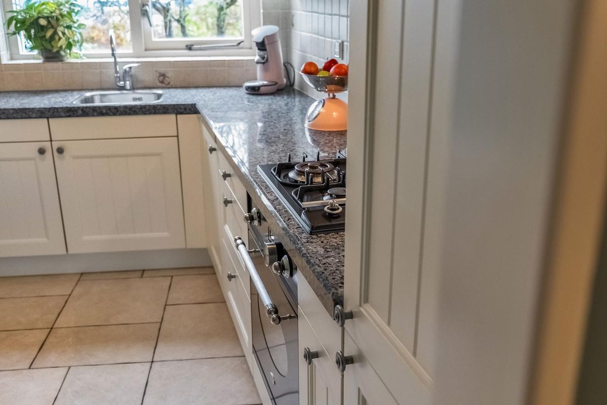 De woning beschikt aan de voorzijde over een moderne keuken (ca. 7 m2) met inbouwapparatuur. De keuken is uitgevoerd in een L-opstelling en voorzien van een koelkast, vrieskast, 4-pits gaskookplaat, afzuigkap, oven en een vaatwasser. Tevens is de keuken voorzien van een enkele spoelbak en voldoende kastruimte. Het geheel is uitgevoerd in lichte kleuren en afgewerkt met een natuursteen aanrechtblad en tegelvloer met vloerverwarming.