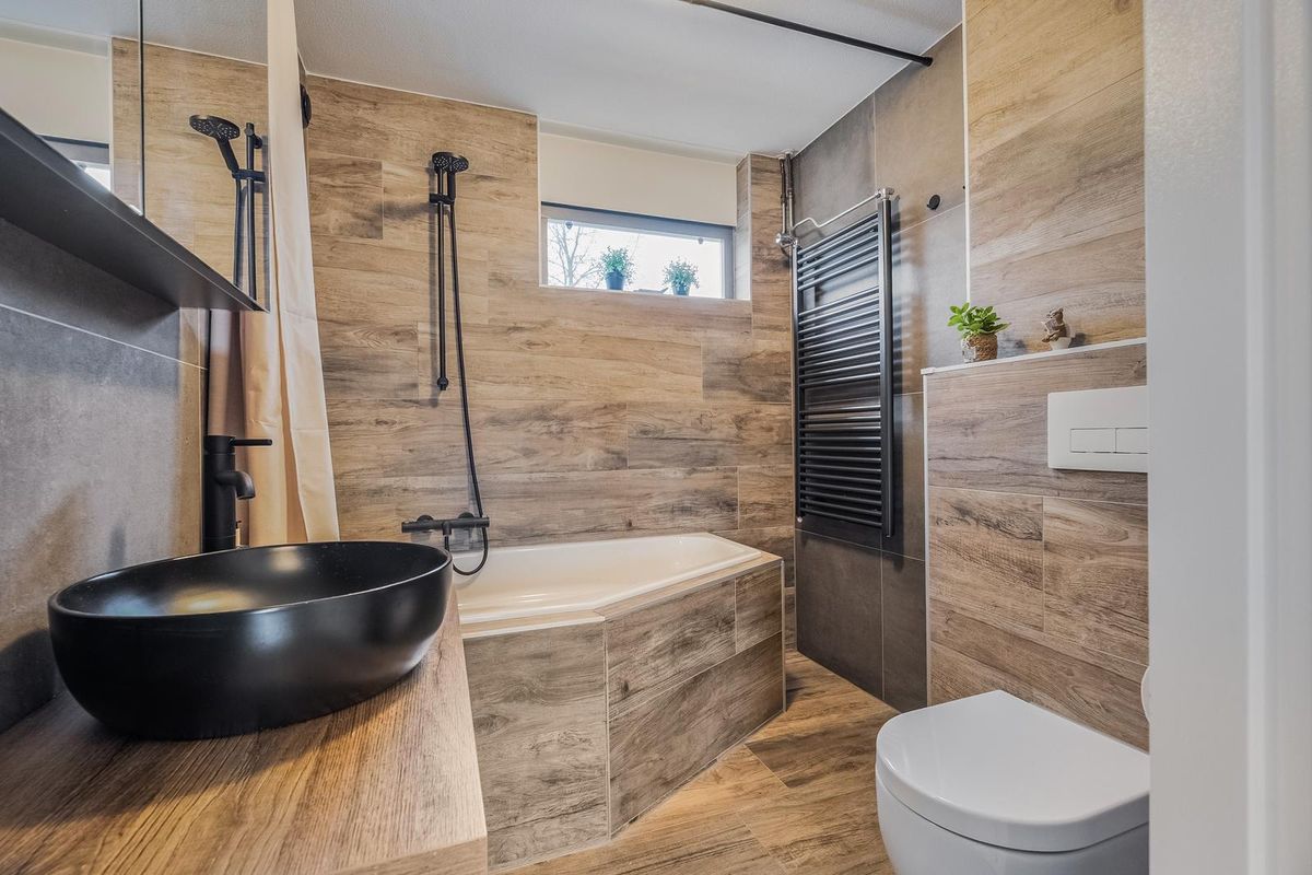 De moderne badkamer (ca. 4 m2) is in 2021 gerenoveerd. De sanitaire voorzieningen zijn een wastafel met wastafelmeubel en extra stopcontacten voor het scheerapparaat en haardroger, spiegel met spiegelkast en verlichting, hangend tweede toilet en een ligbad. De badkamer is geheel betegeld in een lichte kleurstelling.