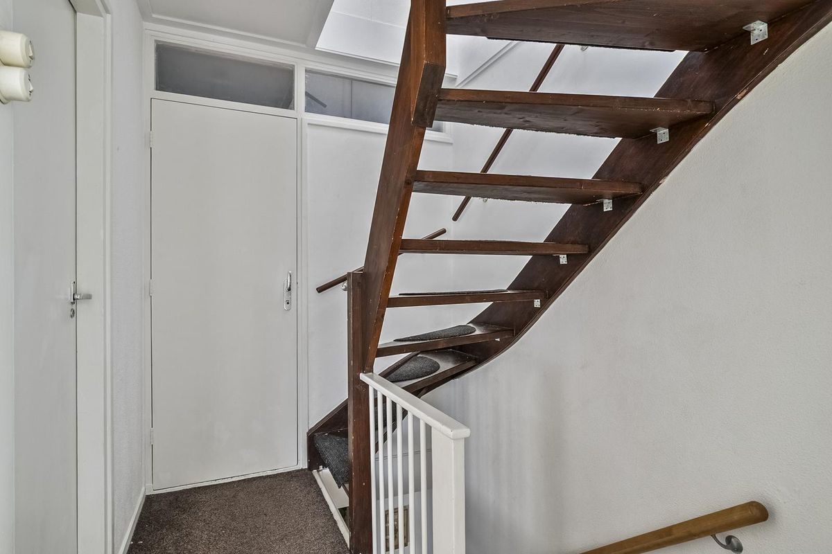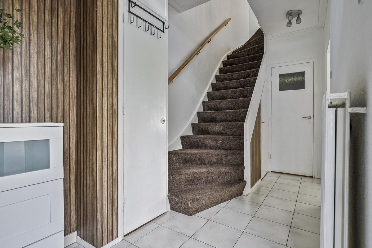 Aan de voorzijde van de woning treft u een verzorgde voortuin, waar u via het pad de voordeur bereikt. Binnengekomen in de hal ervaart u direct de ruime opzet. Hier vindt u toegang tot het toilet, de trap naar de eerste verdieping en de doorgang naar de woonkamer. De hal is praktisch ingericht met ruimte voor een kapstok en opbergmeubel, en vormt zo een aangename binnenkomst.