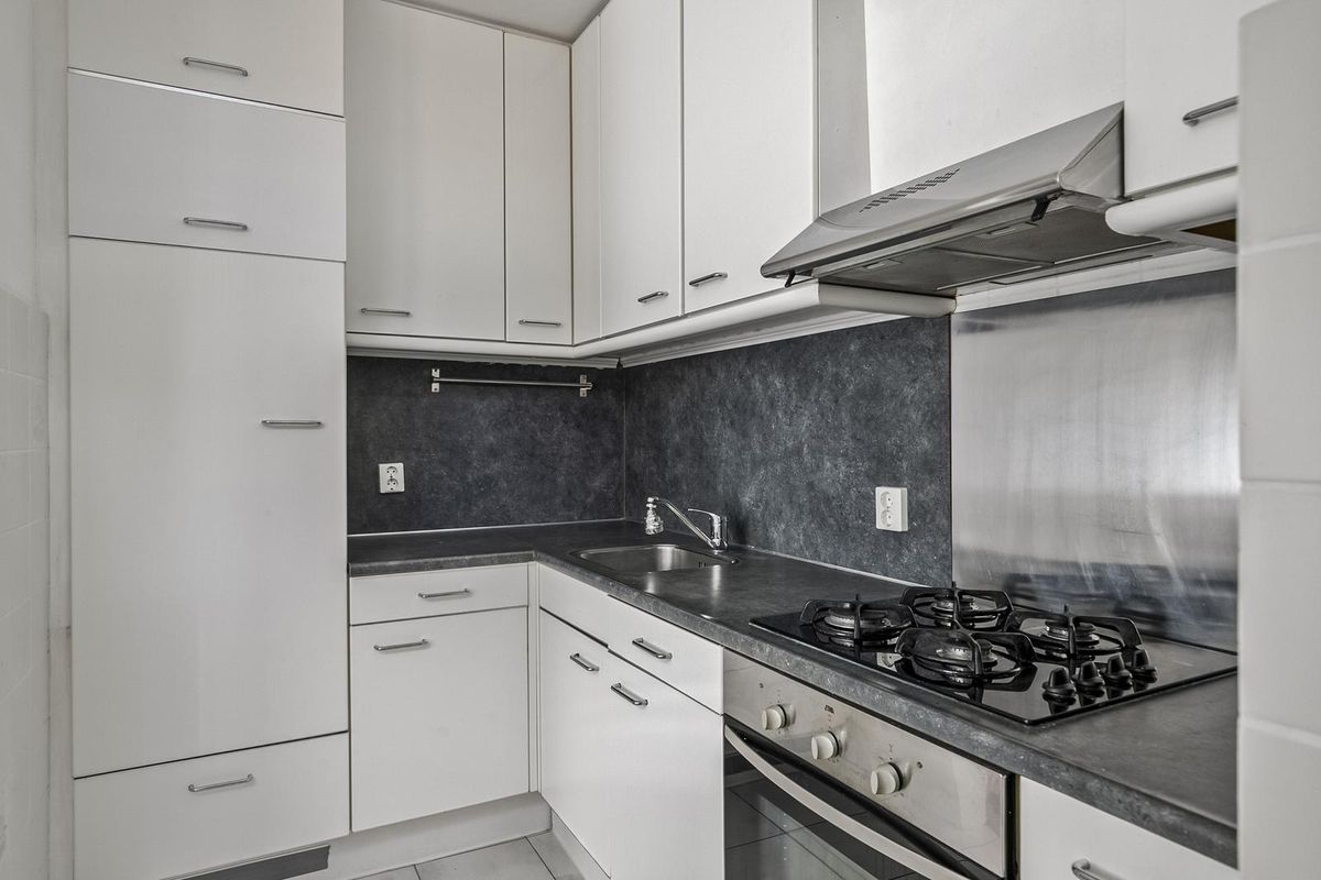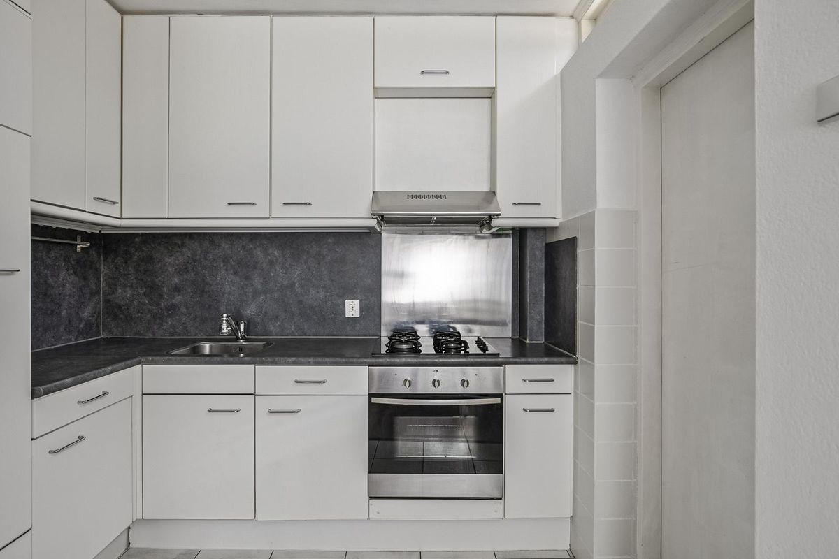 Aan de achterzijde van de woning bevindt zich de keuken, die grenst aan de woonkamer. Deze is praktisch ingericht met een L-vormig aanrechtblad en voorzien van diverse inbouwapparatuur, waaronder een gasfornuis, oven, koelkast en spoelbak. De keuken is functioneel en in nette staat, maar kan naar wens worden gemoderniseerd. Vanuit hier heeft u direct toegang tot de bijkeuken.