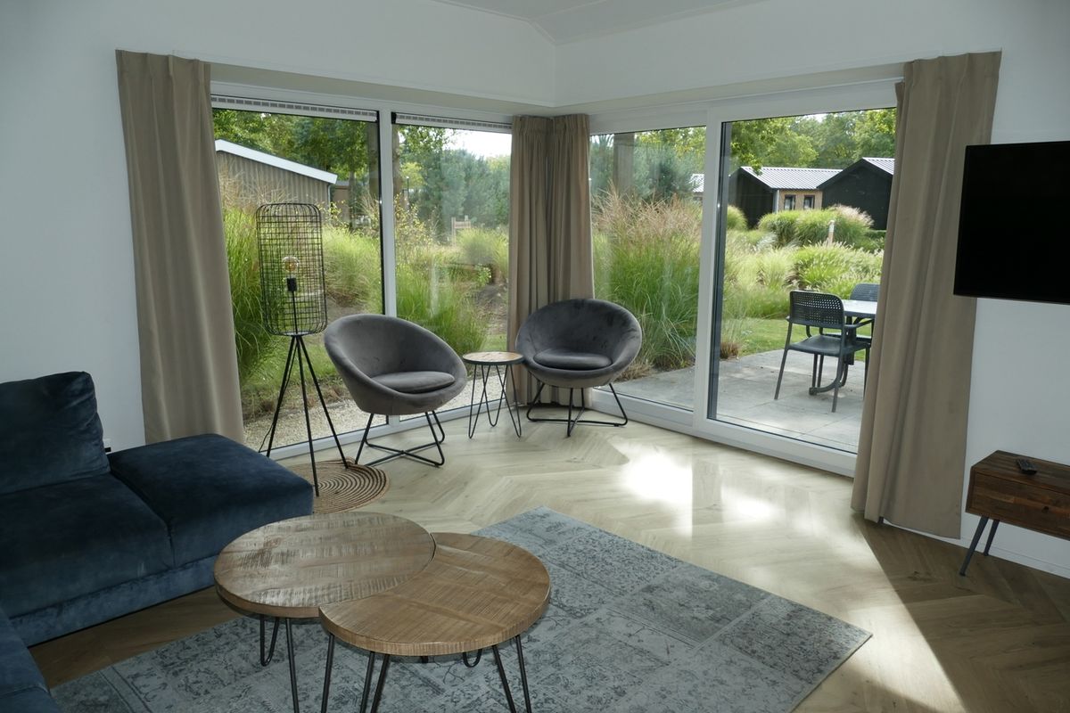 Bij binnenkomst in het chalet stapt u in de royale woonkamer. Deze ruimte is een centraal punt van comfort en ontspanning. Vanuit de woonkamer leidt een brede schuifpui direct naar het terras, wat de verbinding tussen binnen en buiten versterkt. Aansluitend op de woonkamer bevindt zich de eethoek, voorzien van een eettafel met vier stoelen, perfect voor gezellige maaltijden.