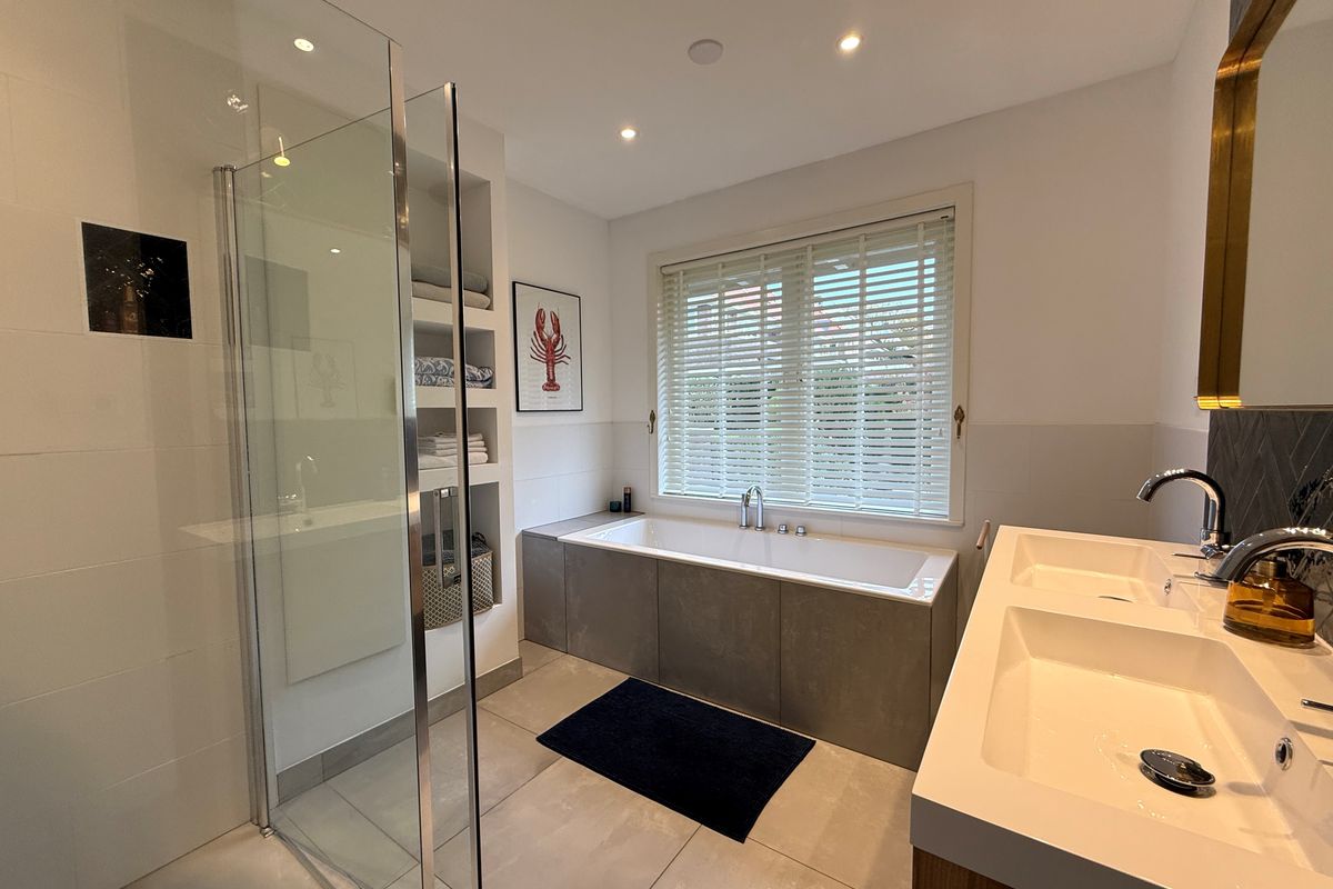 Overloop en toegang tot de ruime ouderslaapkamer, de logeerkamer en de werkkamer. De hoofdslaapkamer is royaal en licht en heeft toegang tot het balkon aan de achterzijde van de woning. De logeerkamer aan de voorzijde heeft ook toegang tot een balkon aan de voorzijde. De moderne, luxe badkamer beschikt over een dubbele wastafel met meubel, ligbad en een inloopdouche. Op de overloop is het 2e toilet gelegen.