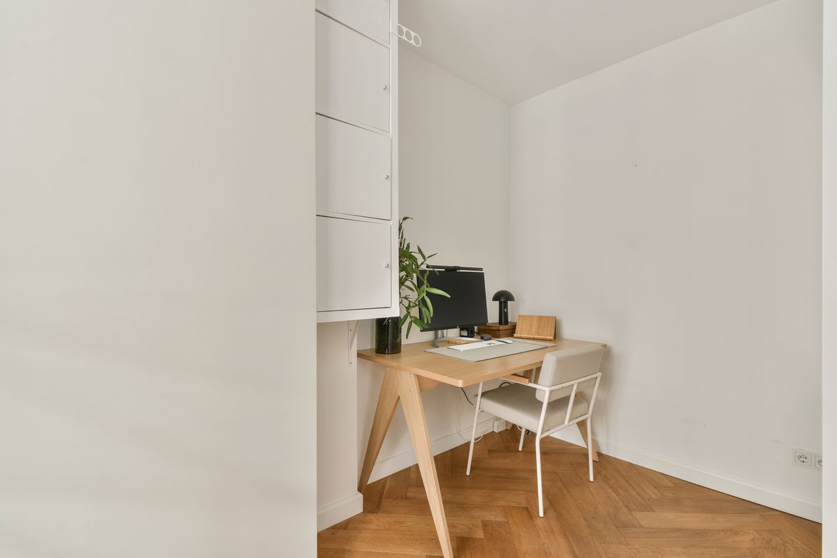Aan de voorzijde bevindt zich de ruime hoofdslaapkamer, stijlvol afgescheiden met een plafondhoge stalen pui. De tweede slaapkamer ligt aan de tuinzijde en doet momenteel dienst als werk- en logeerkamer. Hier ligt een karakteristieke houten visgraatvloer, die de ruimte een warme uitstraling geeft.
