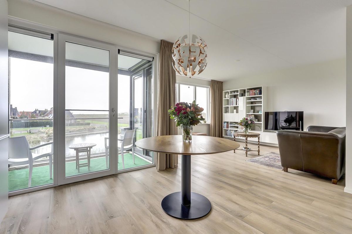 Aansluitend bevindt zich het balkon, waar u heerlijk kunt zitten met uitzicht op de vijver en in de verte de boten die langs varen. Een perfecte plek voor een kop koffie in de ochtend of een borrel aan het einde van de dag. Door de zuiden ligging, geniet u van veel zonuren op het balkon.