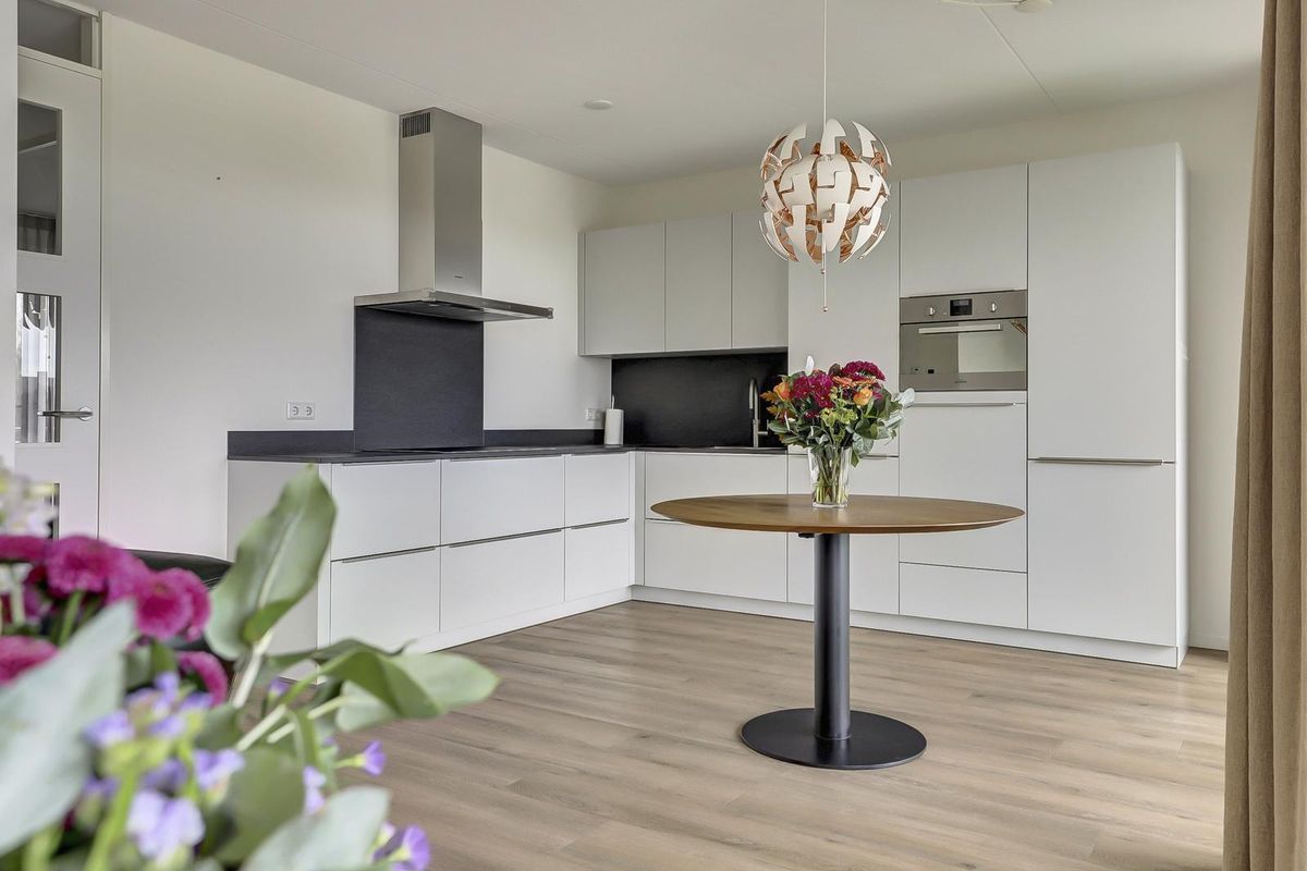 De open keuken is uitgevoerd in een strak wit design met een donker werkblad en is volledig uitgerust met moderne inbouwapparatuur, waaronder een inductiekookplaat, afzuigkap, combi-oven, koelkast en vaatwasser. Hier is alle ruimte om met plezier te koken en gezellig te tafelen.