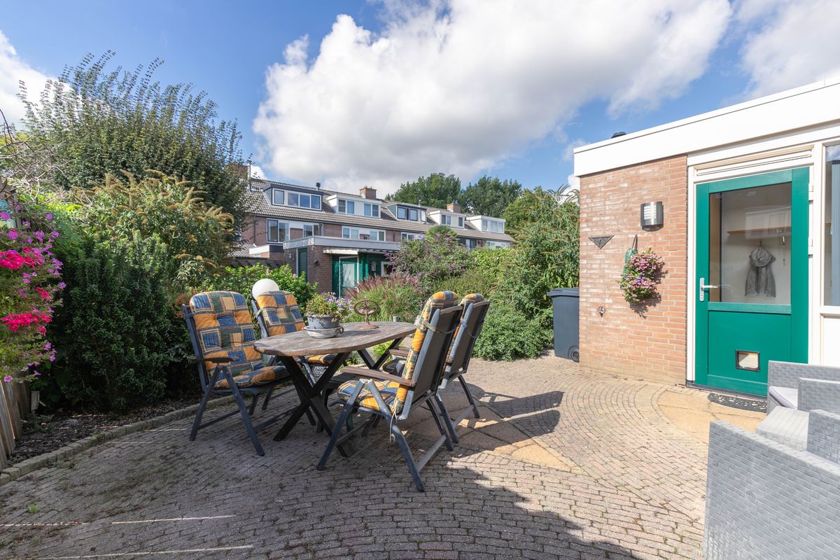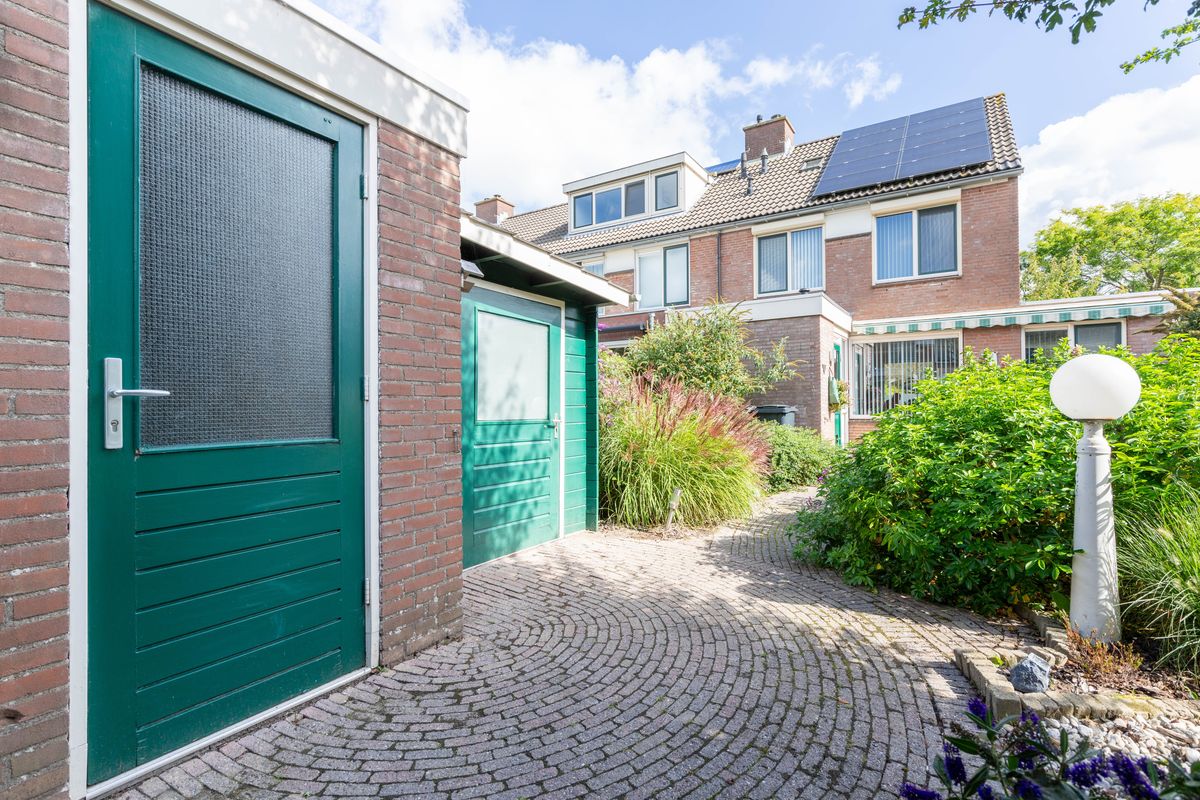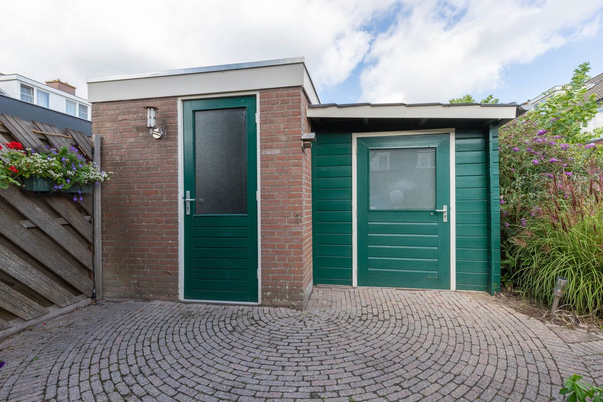 Aan de achterzijde van de woonkamer is een praktische bijkeuken met wastafel, afvoer en wasmachine/droger opstelling in een kastenwand. Via de bijkeuken is er toegang tot de ruime op het zuidwesten gelegen achtertuin. Naast de vrijstaande stenen berging is er ook nog een houten schuurtje.