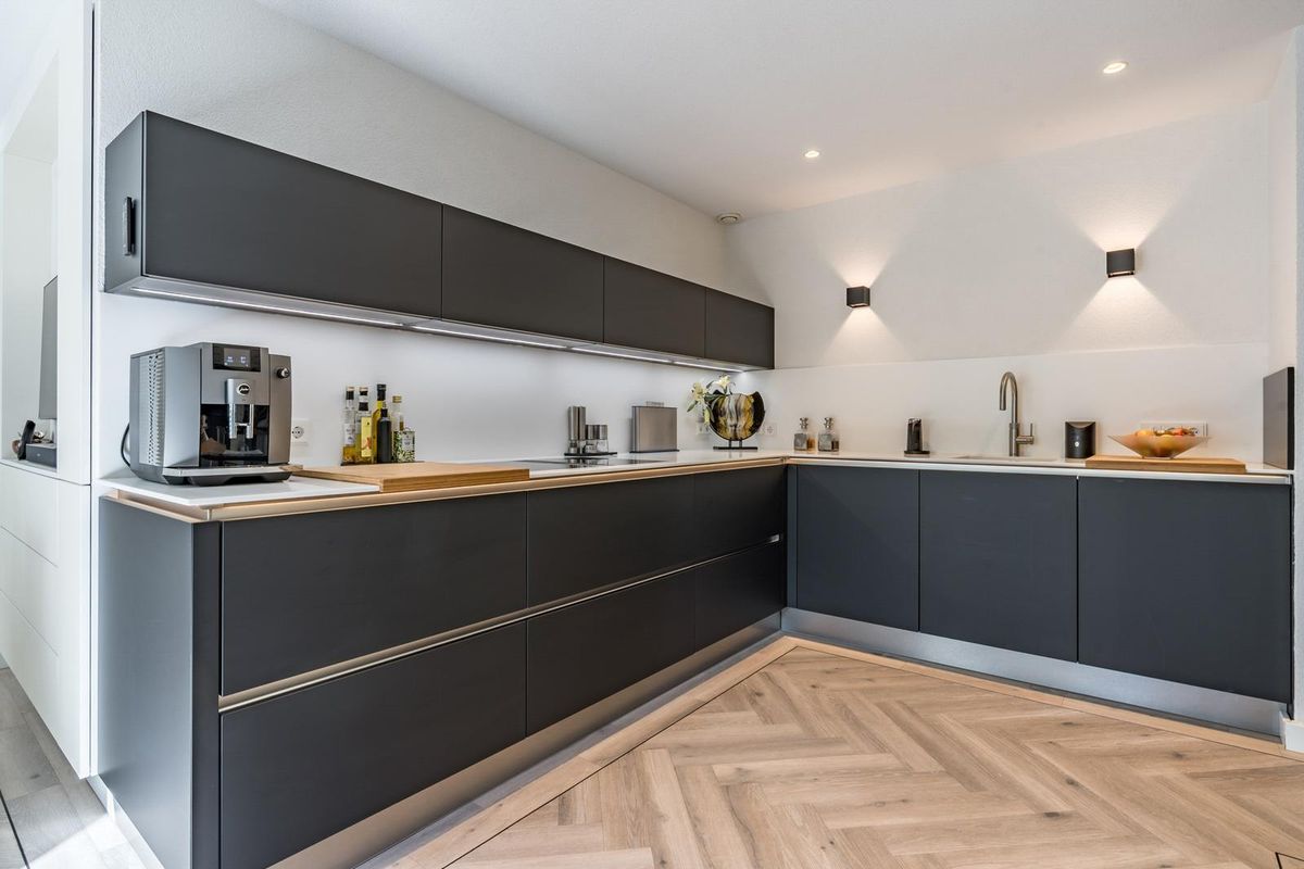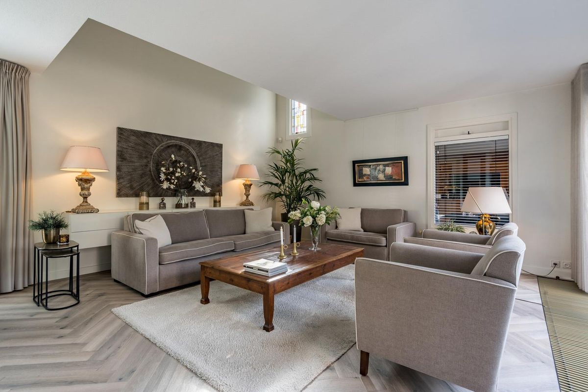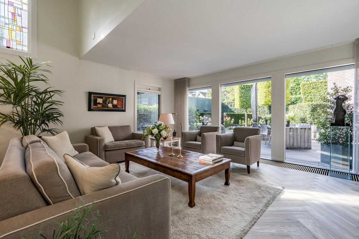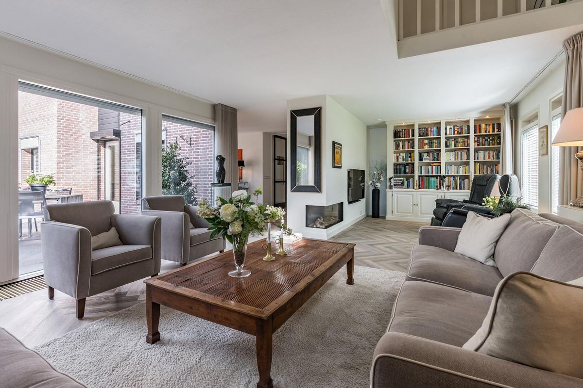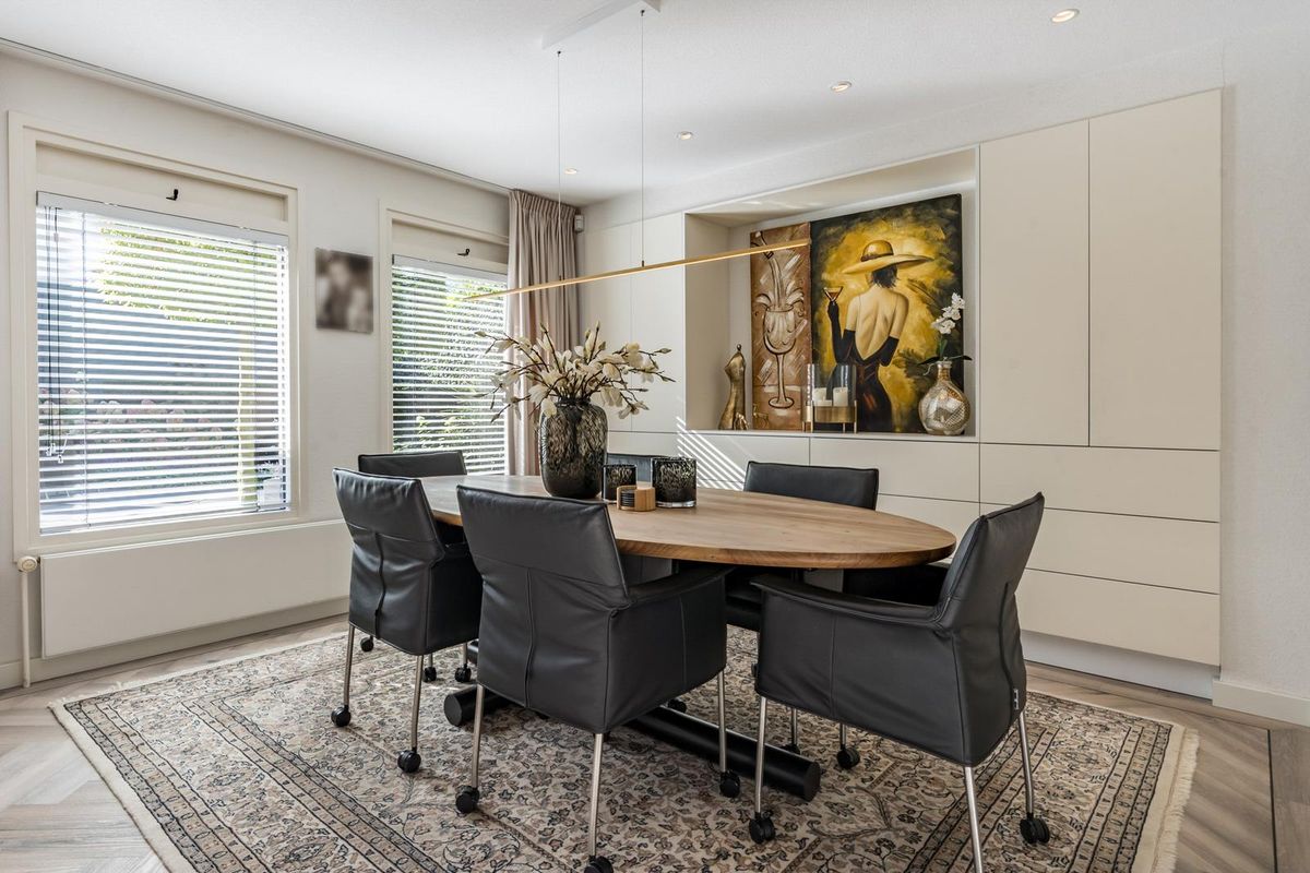 Zonnige tuingerichte living met vide en pvc-visgraatvloer. TV-/leeshoek met inbouw gashaard en kasten- (boeken)wand. Eetkamer met vaste kastenwand en aansluitend de in 2018 geplaatste luxe aanbouwkeuken met o.a. oven, combimagnetron, inductiekookplaat met Bora-afzuigsysteem, warmhoudlade, vaatwasser, koelkast en Quooker-kraan.