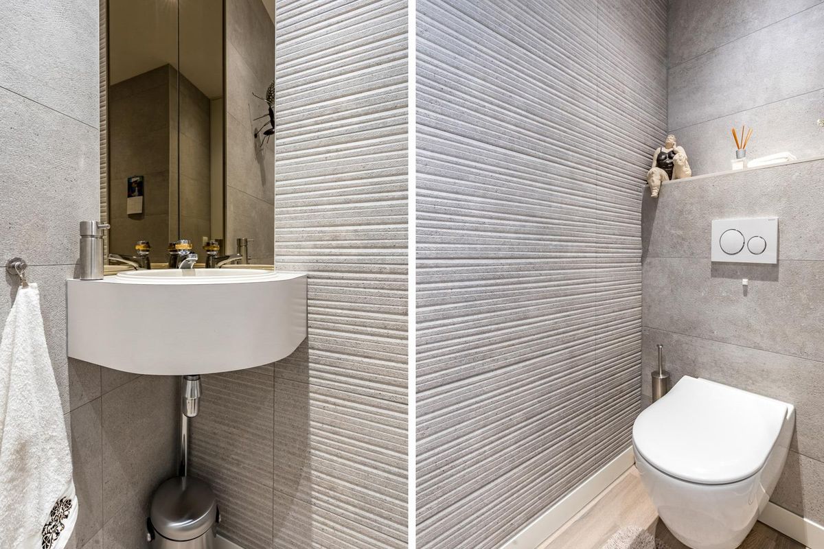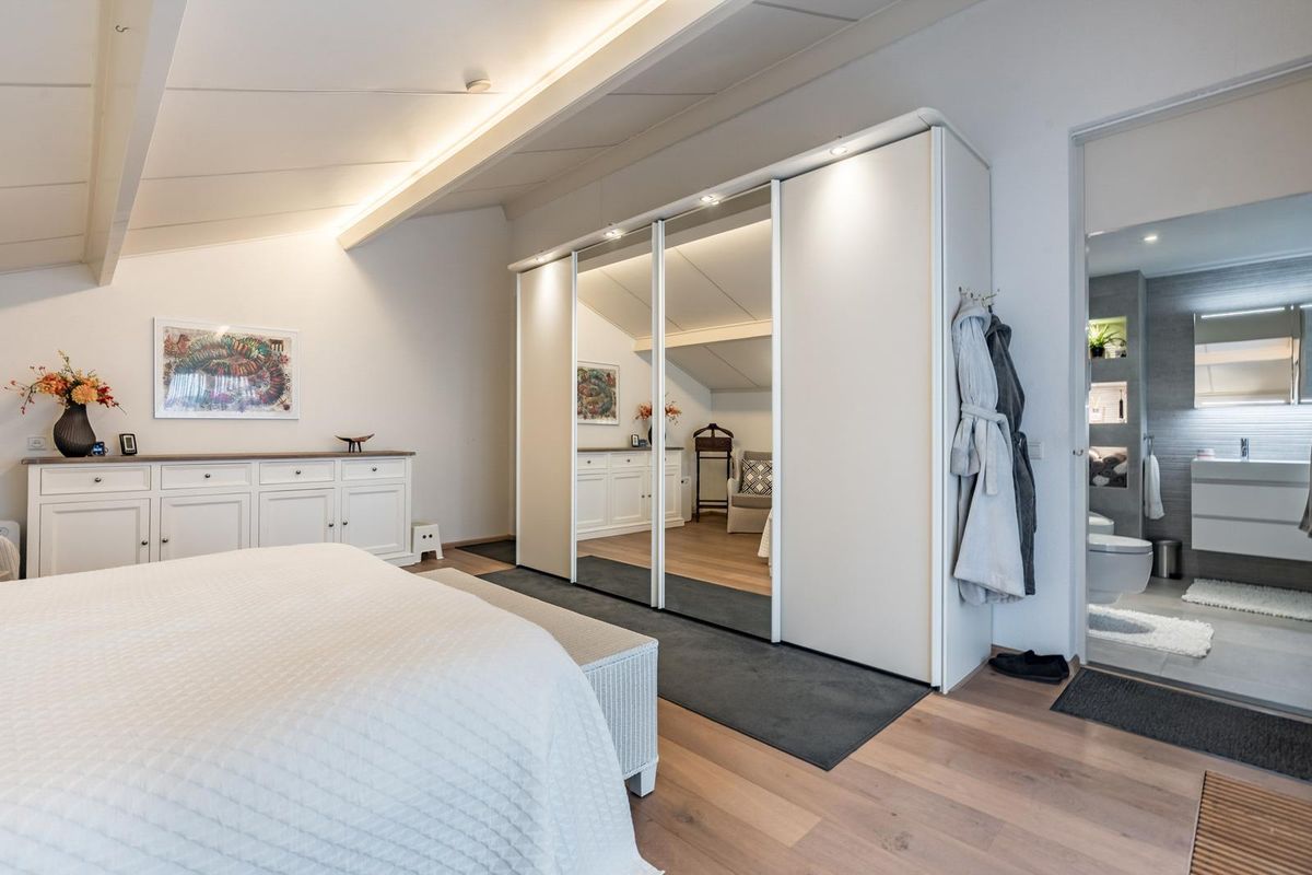 Royale ouderslaapkamer met schuifpui naar het terras en eigen luxe badkamer (2023) met inloopdouche, dubbel wastafelmeubel, wandtoilet, designradiator en vloerverwarming.