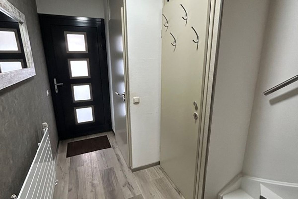 Entree/gang 3,05 x 1,00 met pvc-laminaatvloer, meterkast met slimme meters, gastentoilet 1,20 x 0,85 met pvc-laminaatvloer, hangtoilet en meubel met wastafel, deur naar woonkamer en trap naar verdieping.