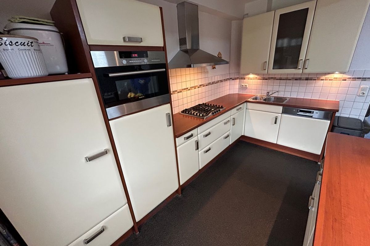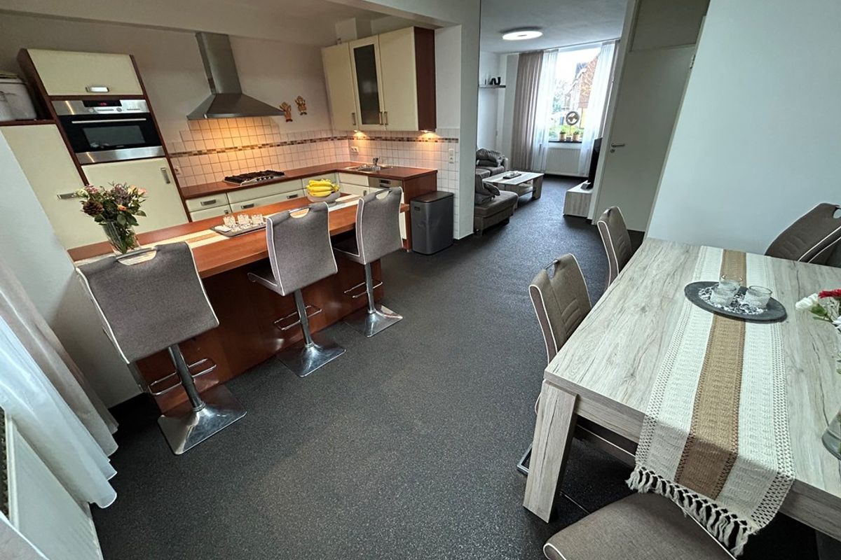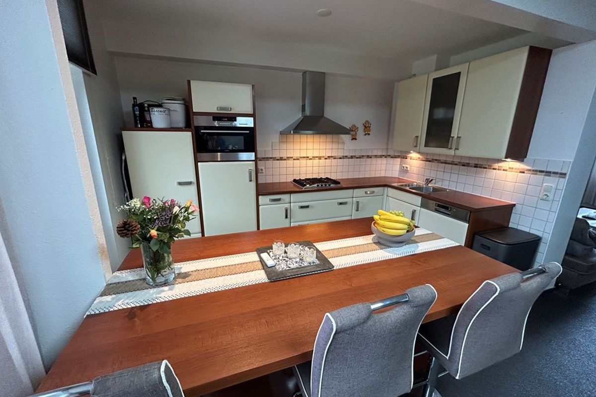 Keuken 3,75 x 2,15 met siergrindvloer, deur naar achtertuin en mooie aanbouwkeuken met zit-eiland met 3 stoelen, 4-pits gasfornuis met RVS-afzuigunit, vaatwasser, combi-magnetron, koelkast, vrieskast, draaideurcarrousel en dubbele spoelbak.