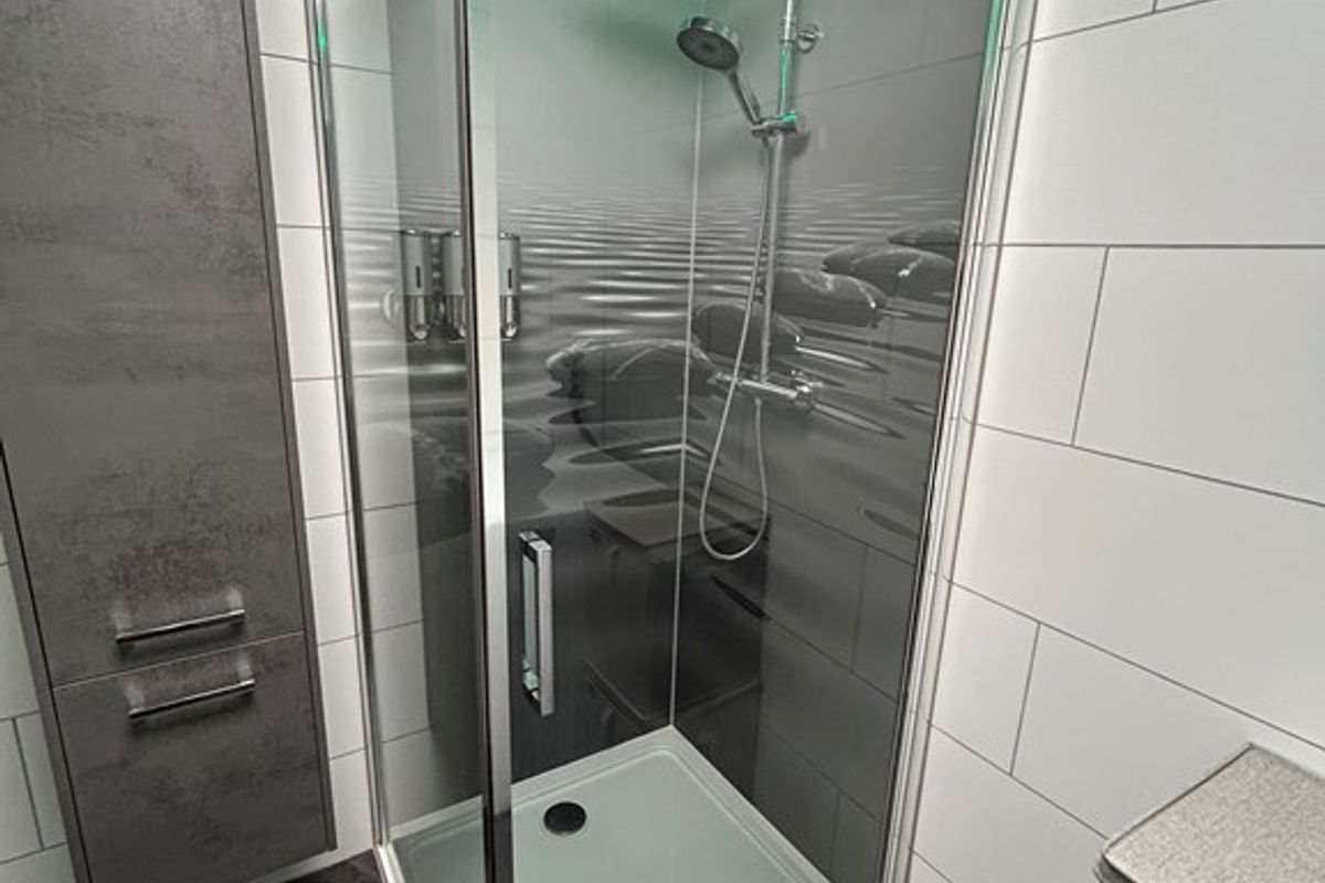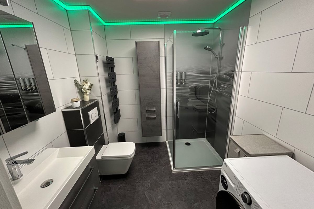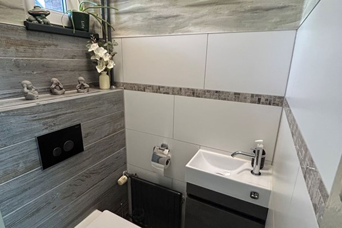 Luxe badkamer 2,25 x 2,20 met pvc-laminaatvloer, inloopdouche met cabine, hangtoilet, badkamermeubel met keramische wastafel, aansluitingen was-apparatuur en design radiator.