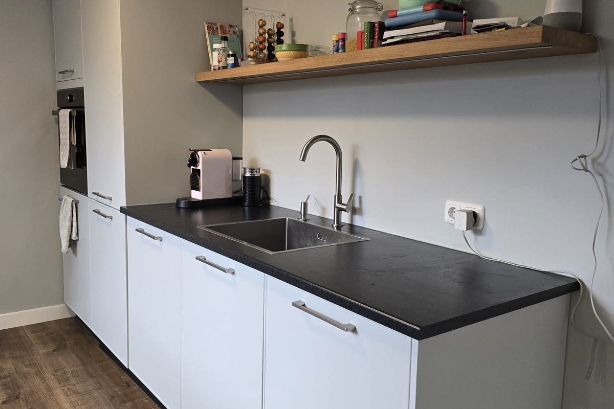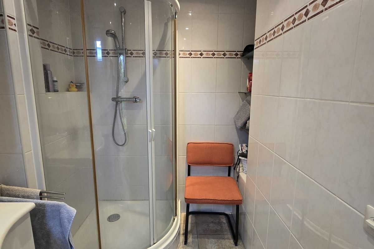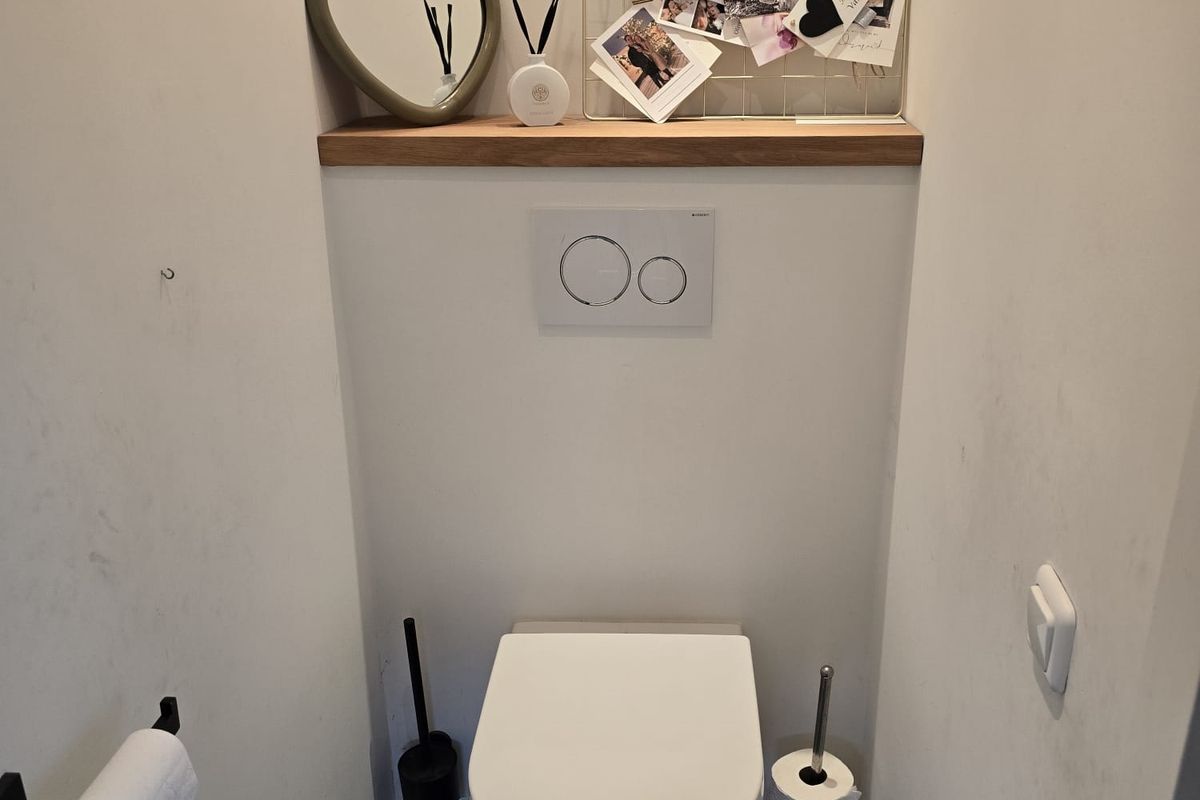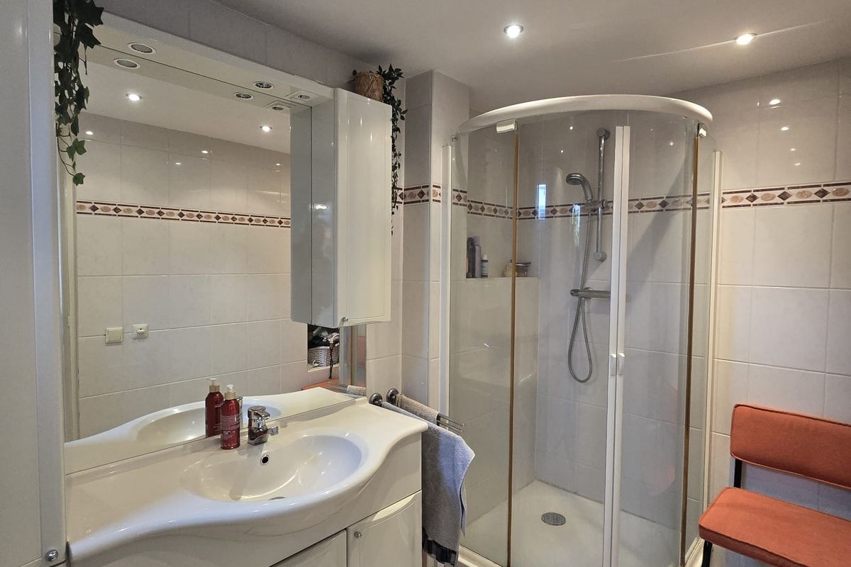 Achter de keuken bevindt zich het toilet en aansluitend de ruime badkamer, uitgerust met een groot wastafelmeubel met éénhendelmengkraan, veel opbergruimte, een radiator en een ruime douchecabine.
