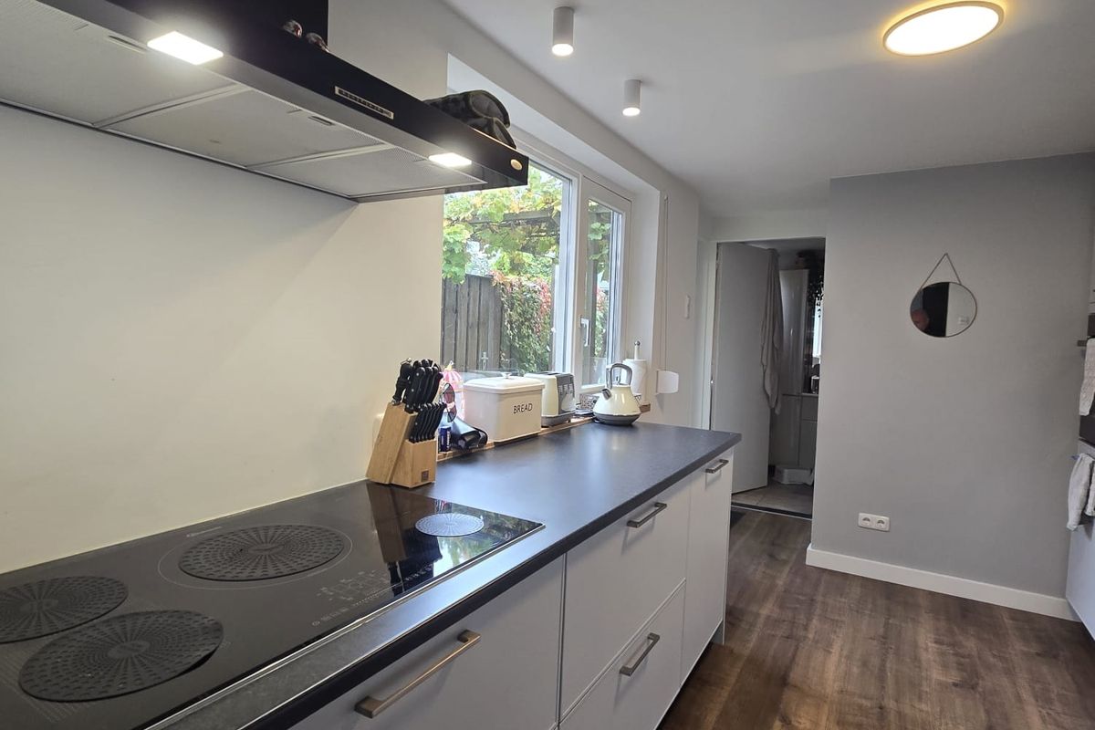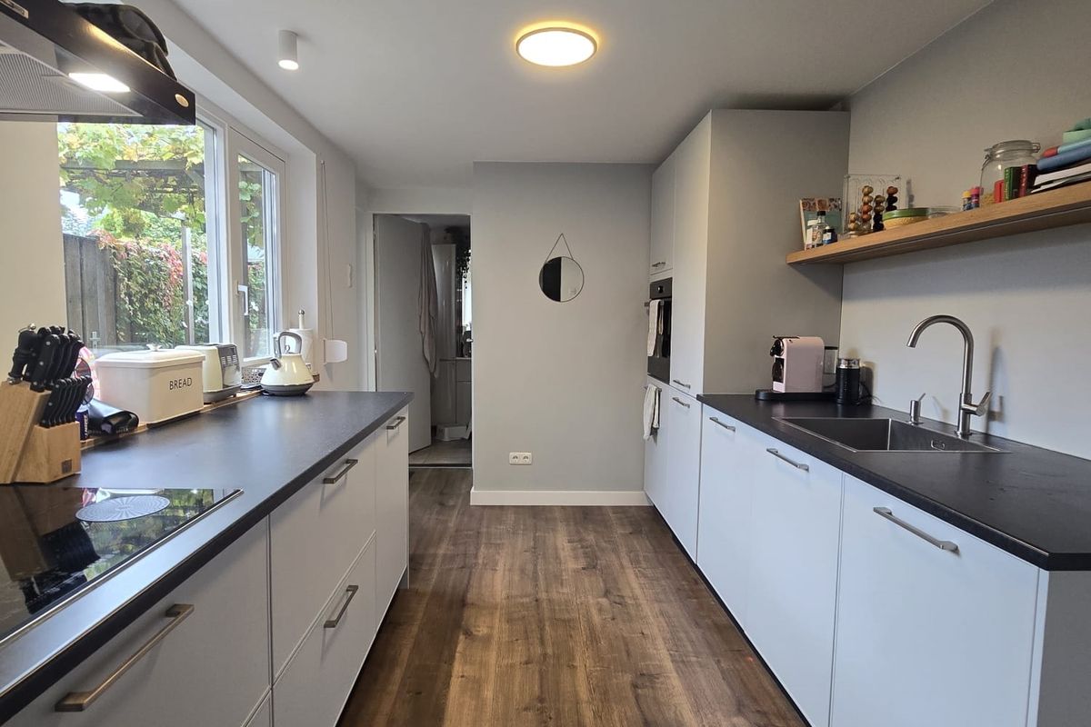 De halfopen keuken sluit hier naadloos op aan en is voorzien van moderne inbouwapparatuur: een vijfpits inductiekookplaat, vaatwasser, koel-vriescombinatie en een oven, de keuken beschikt ook over een ruime kelderkast.