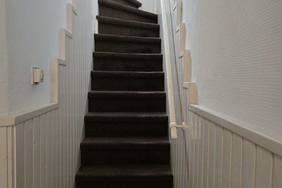 Via de trap in de gang bereik je de eerste verdieping. Op de overloop bevindt zich het tweede toilet.