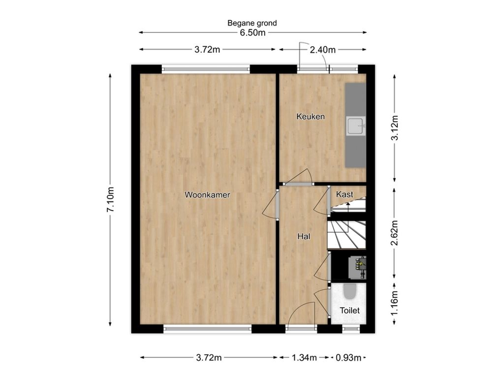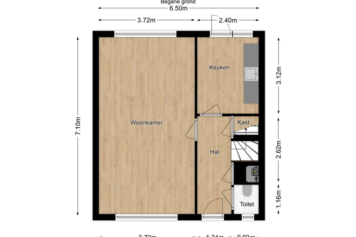 Binnenkomst in de hal met toilet, provisiekast en meterkast (5 groepen, 2 aardlekschakelaars). Vanuit hier stap je de lichte doorzonwoonkamer in en de keuken met eenvoudige opstelling en deur naar het terras en de tuin.
