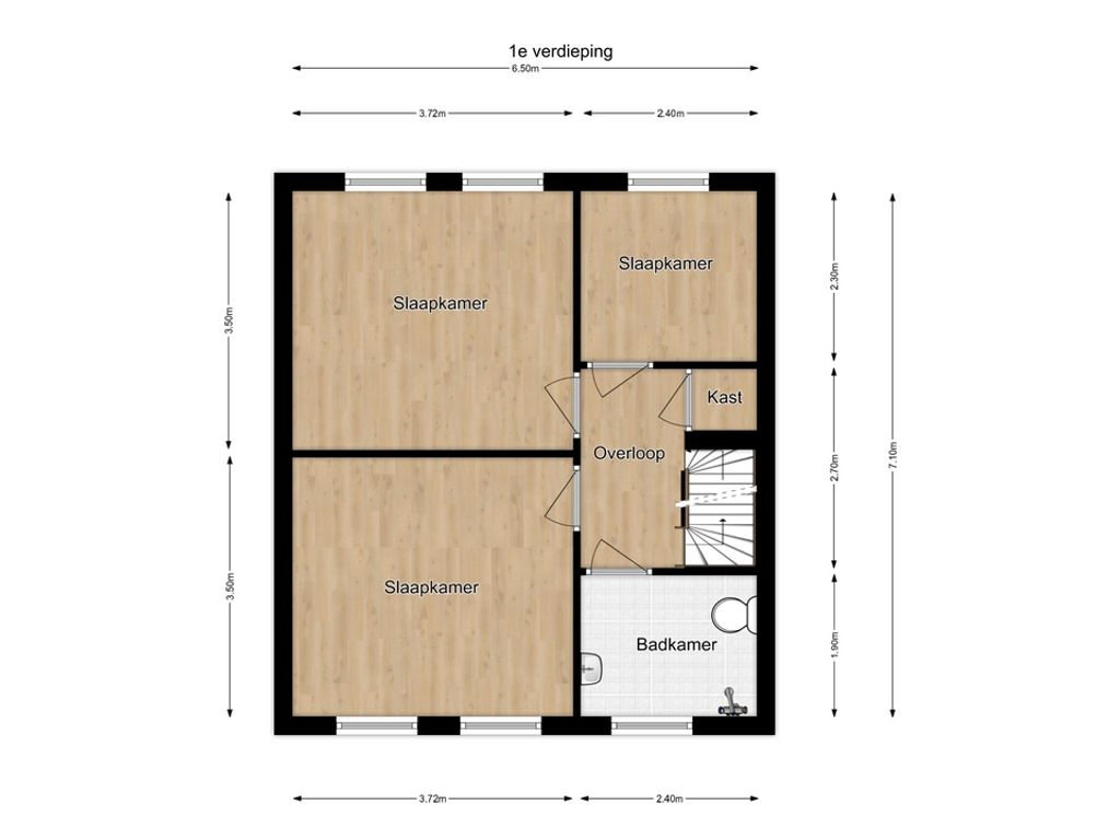 Overloop, drie slaapkamers en een badkamer met douche, wastafel en tweede toilet.
