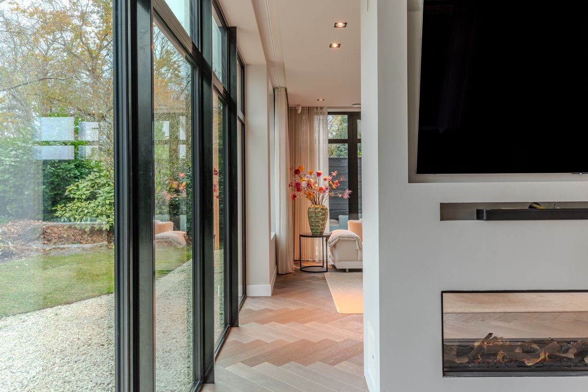Een gashaard scheidt subtiel het zitgedeelte van de televisiehoek, zonder de ruimtes volledig te sluiten. Vanuit de woonkamer geniet u van een fraai uitzicht over het Hertenkamp, een iconisch en groen decor dat typerend is voor Bergen.