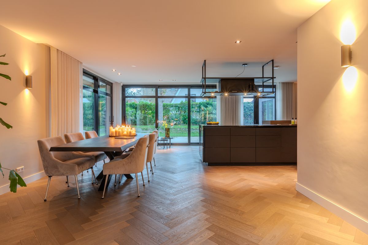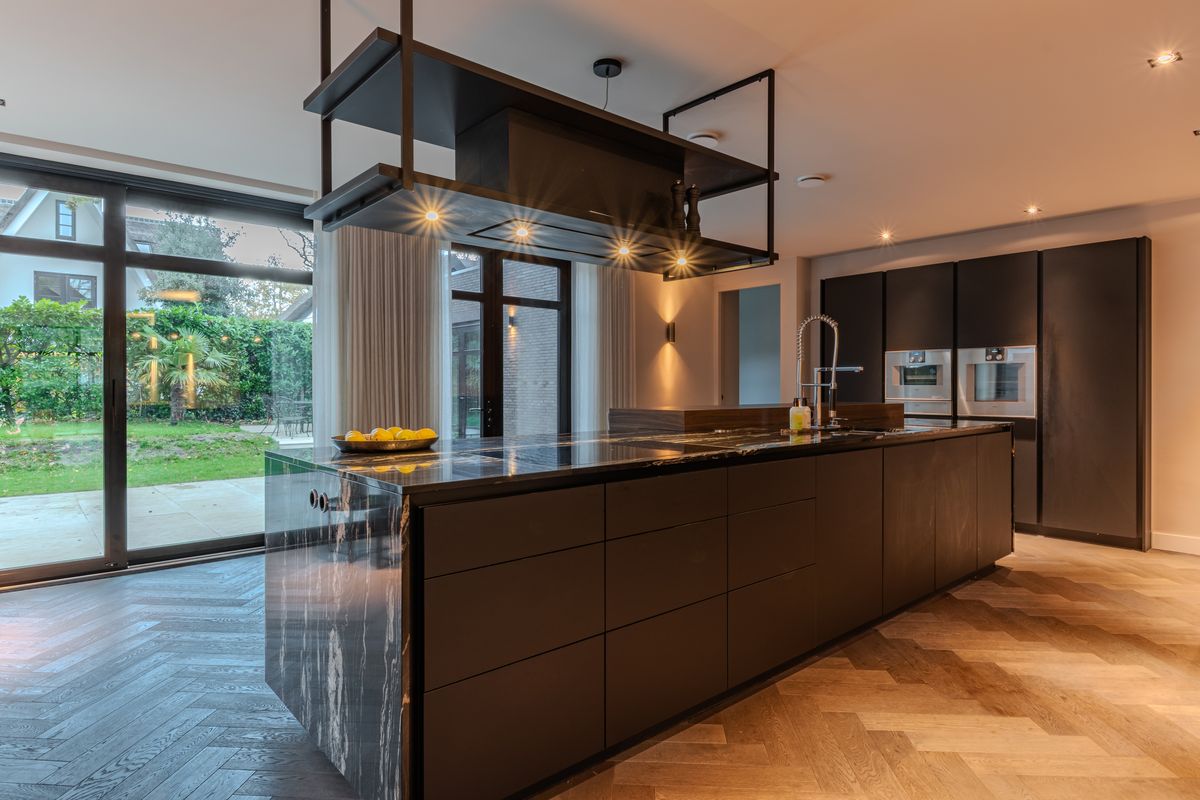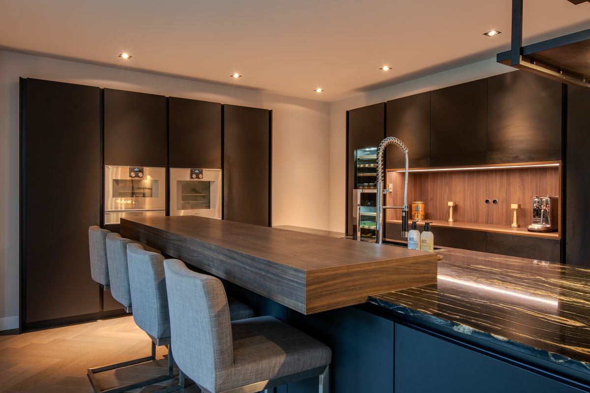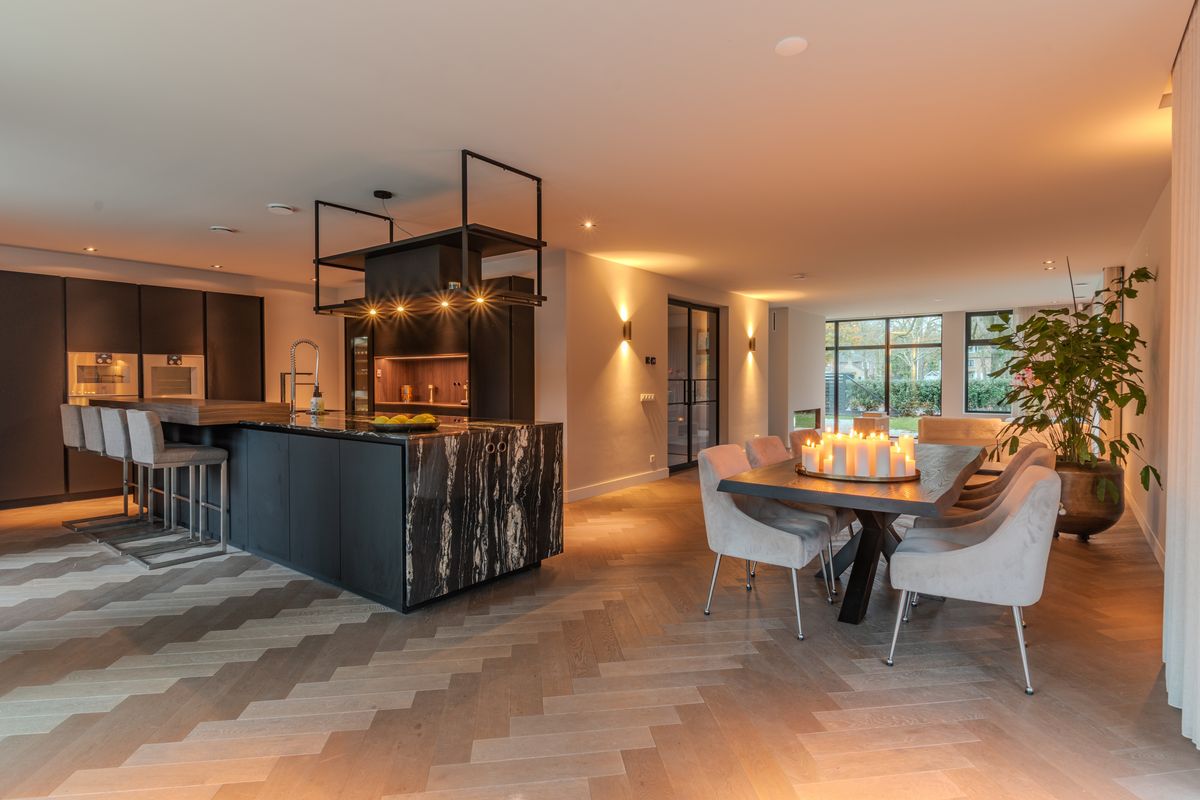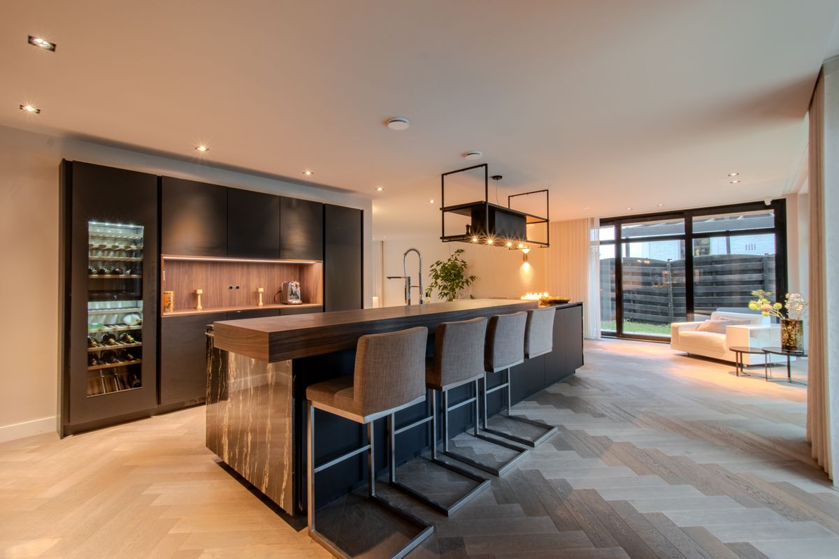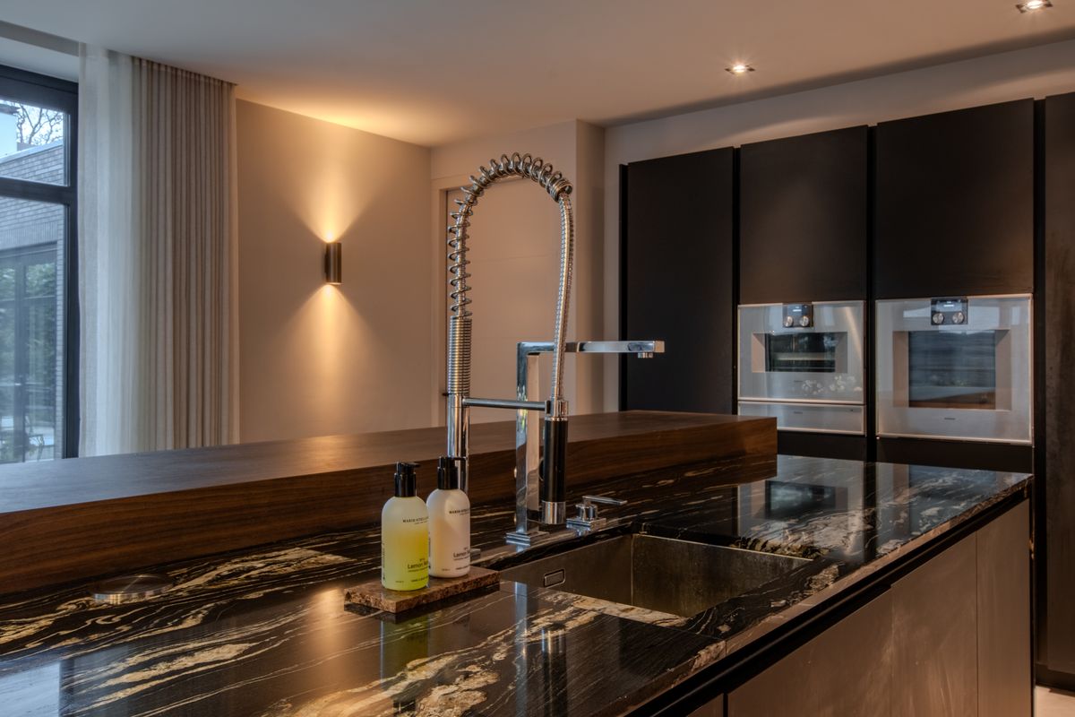 De woonkeuken is volledig uitgerust met Gaggenau-apparatuur, een wijnklimaatkast en een kwartsieten kookeiland met een bargedeelte, ideaal om samen te koken en de dag te bespreken. Grote glazen achterwanden en schuifpuien verbinden de keuken op natuurlijke wijze met de omsloten tuin met meerdere terrassen, waardoor binnen en buiten naadloos in elkaar overvloeien. Dankzij het doordachte ontwerp en de warme materialen ontstaat hier een gezellige, uitnodigende sfeer waarin koken en samen zijn centraal staan.