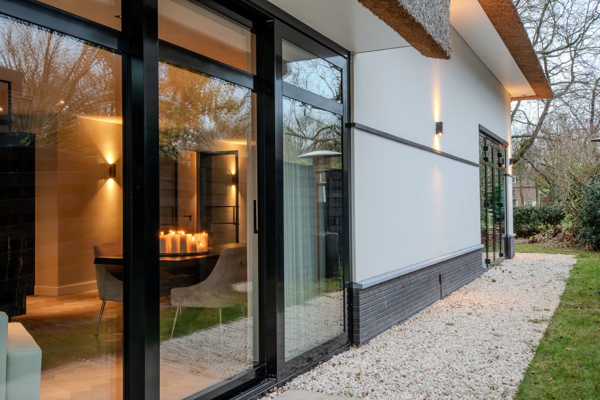 De rietgedekte villa beschikt over een garage met vloerverwarming en elektrische deur, een elektrisch bedienbare toegangspoort en ruimte om meerdere auto’s op eigen terrein te parkeren. Daarnaast is de woning uitgerust met een geavanceerd domoticasysteem, waarmee verlichting eenvoudig centraal kan worden aangestuurd.