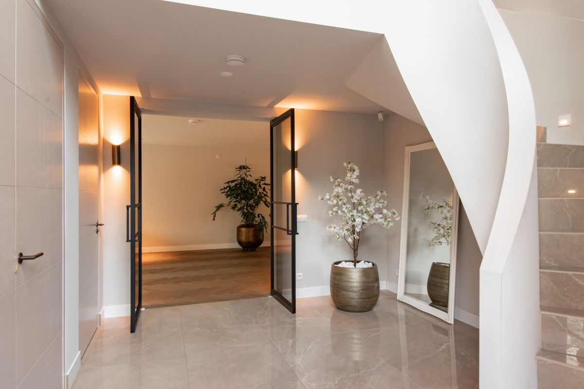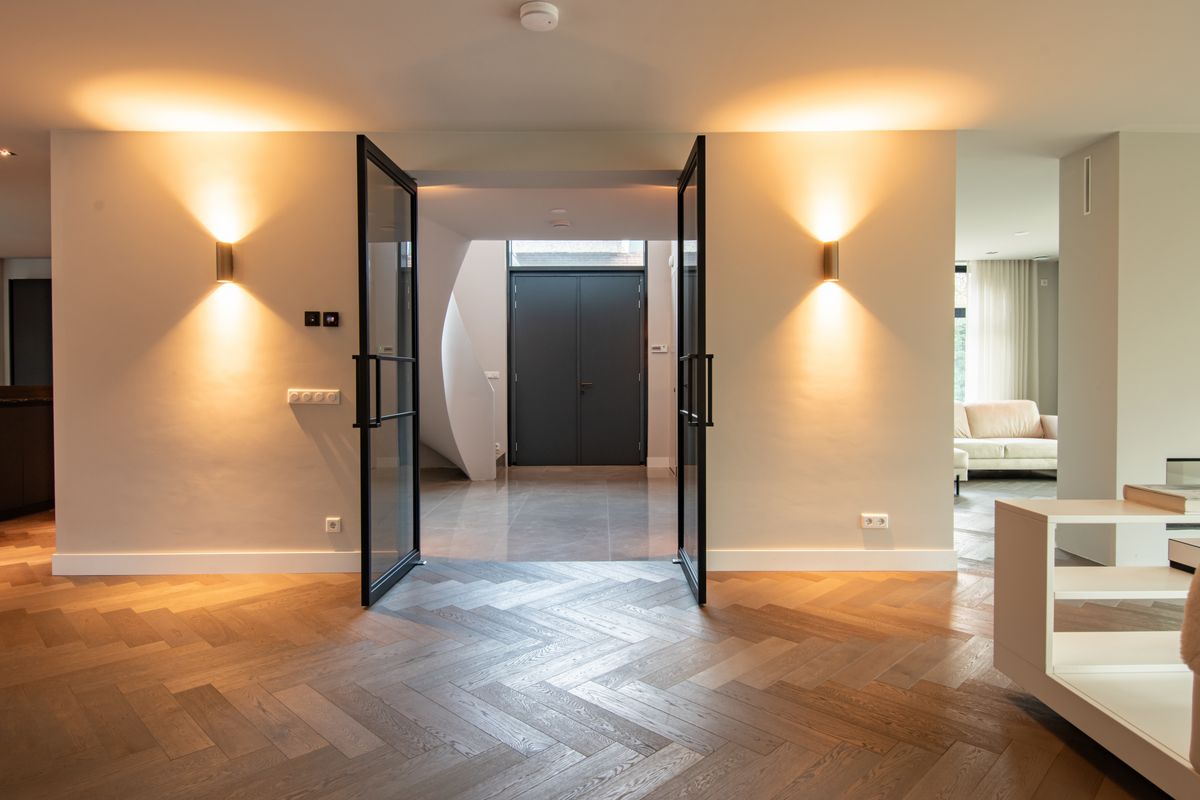 Bij binnenkomst valt direct de ruime entree met grote vide op, die zorgt voor een aangename lichtinval en een gevoel van ruimte. Via de hal bereikt u de living, waar vloerverwarming en vloerkoeling het hele jaar door voor optimaal comfort zorgen. De eikenhouten vloer vangt het licht op een natuurlijke manier, en samen met de zorgvuldig gekozen wanden en verlichting van Erik Kuster ontstaat een warme, uitnodigende sfeer.