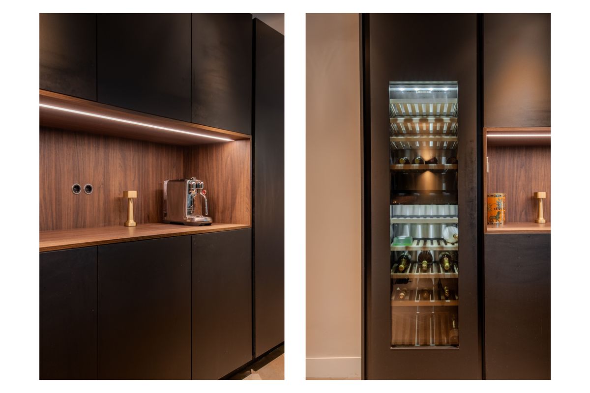 The kitchen is fully equipped with Gaggenau appliances, a wine climate cabinet, and a quartzite cooking island with bar seating—ideal for cooking together and enjoying the day. Large glass rear façades and sliding doors seamlessly connect the kitchen with the enclosed garden featuring multiple terraces, allowing indoor and outdoor living to flow naturally. Thanks to its thoughtful design and warm materials, this area exudes a cosy and inviting atmosphere where cooking and spending time together are central.