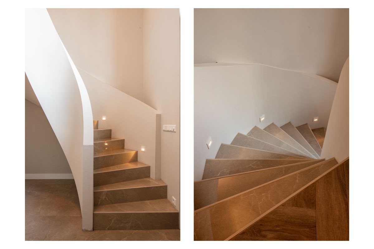 The first floor features underfloor heating and cooling and is finished with high-quality materials. Up the staircase with the void, you reach the upper floor, where light and spaciousness immediately stand out. From here, you also have a beautiful view of the generous hallway and the elegant staircase.