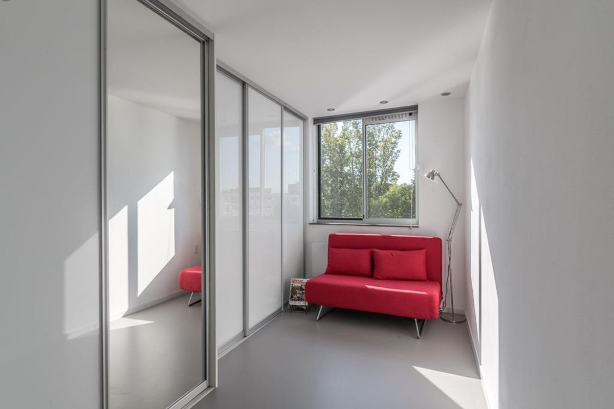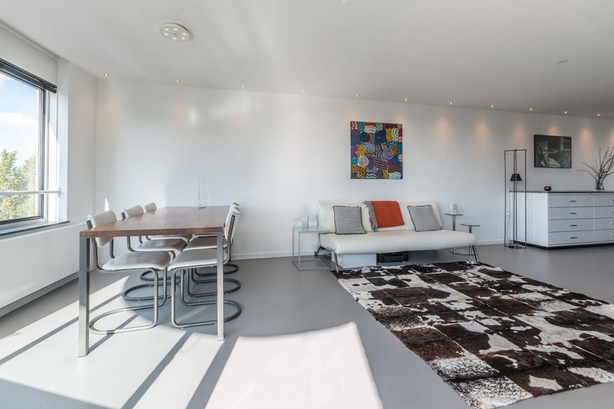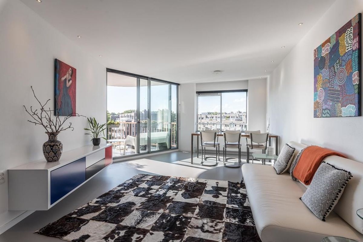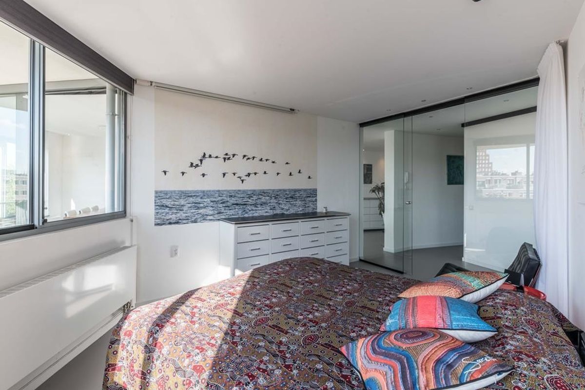 The building is entered via a communal entrance. The apartment is situated on the 4th floor and can be reached via elevator and stairs. The living room has a spacious lounge/dining area opening onto a large balcony facing South West with a beautiful view on the Kostverlorenvaart in Westerpark, Amsterdam.